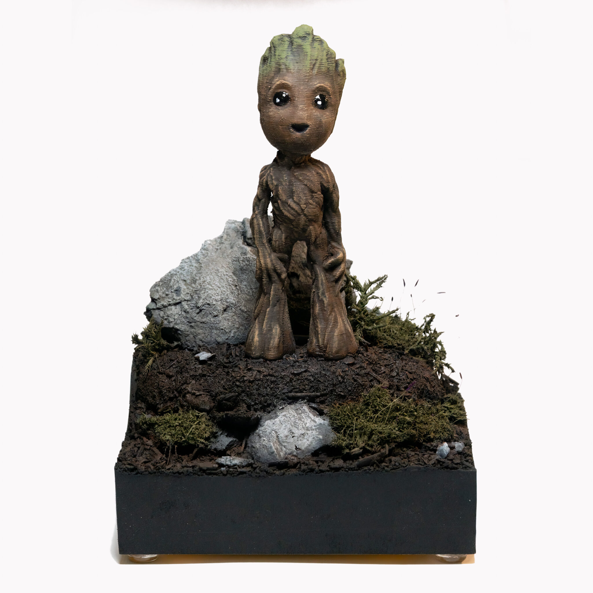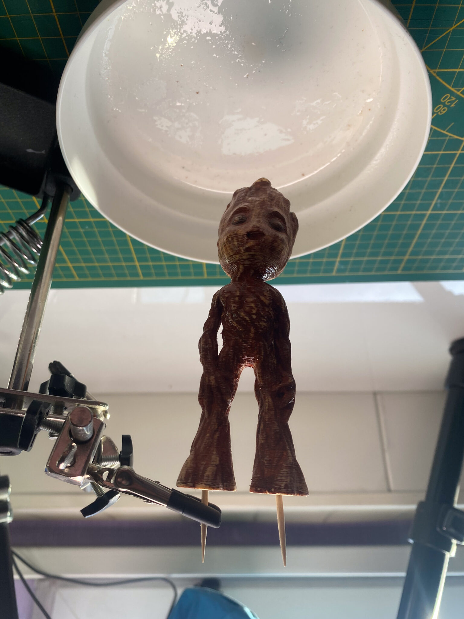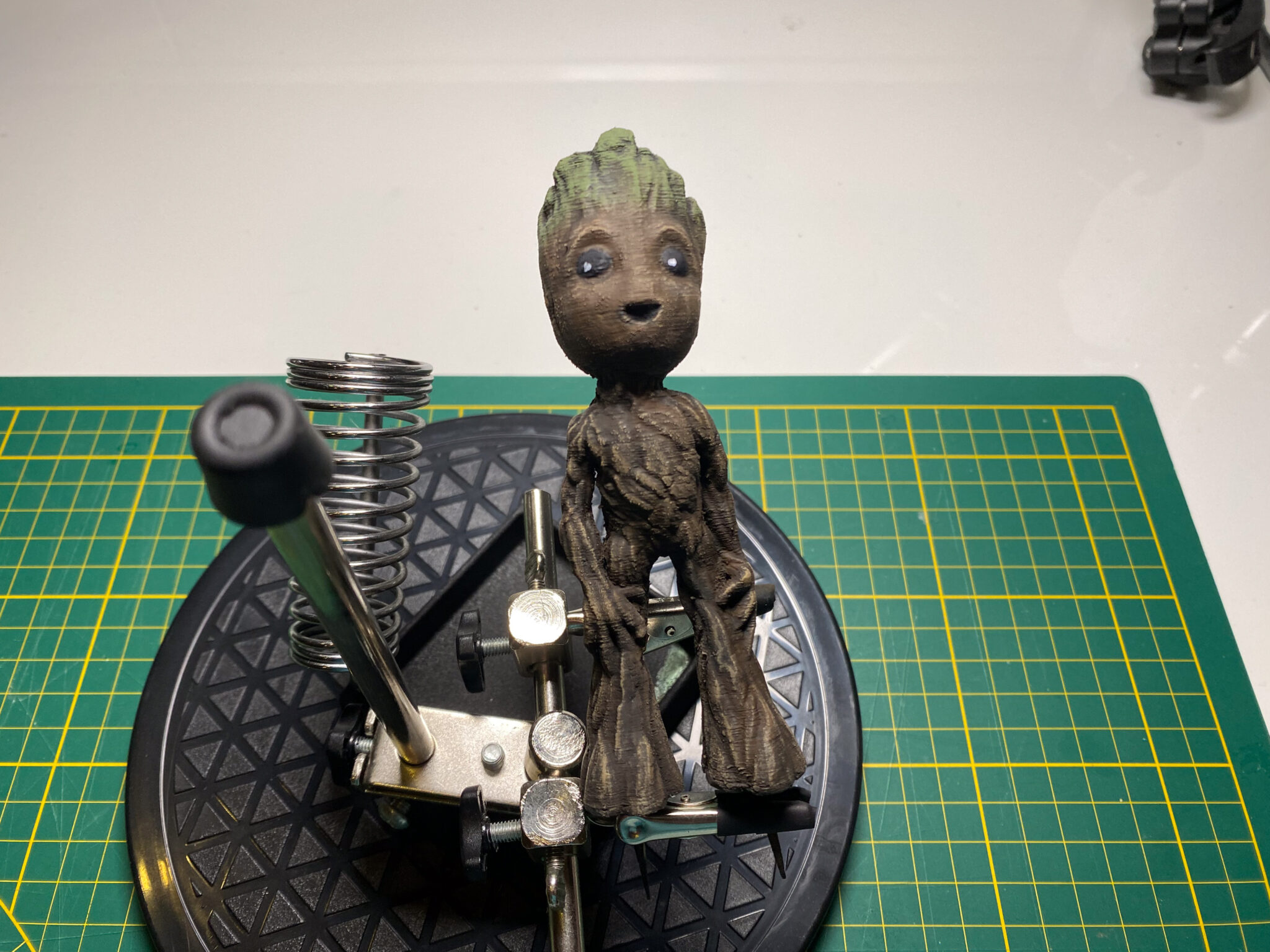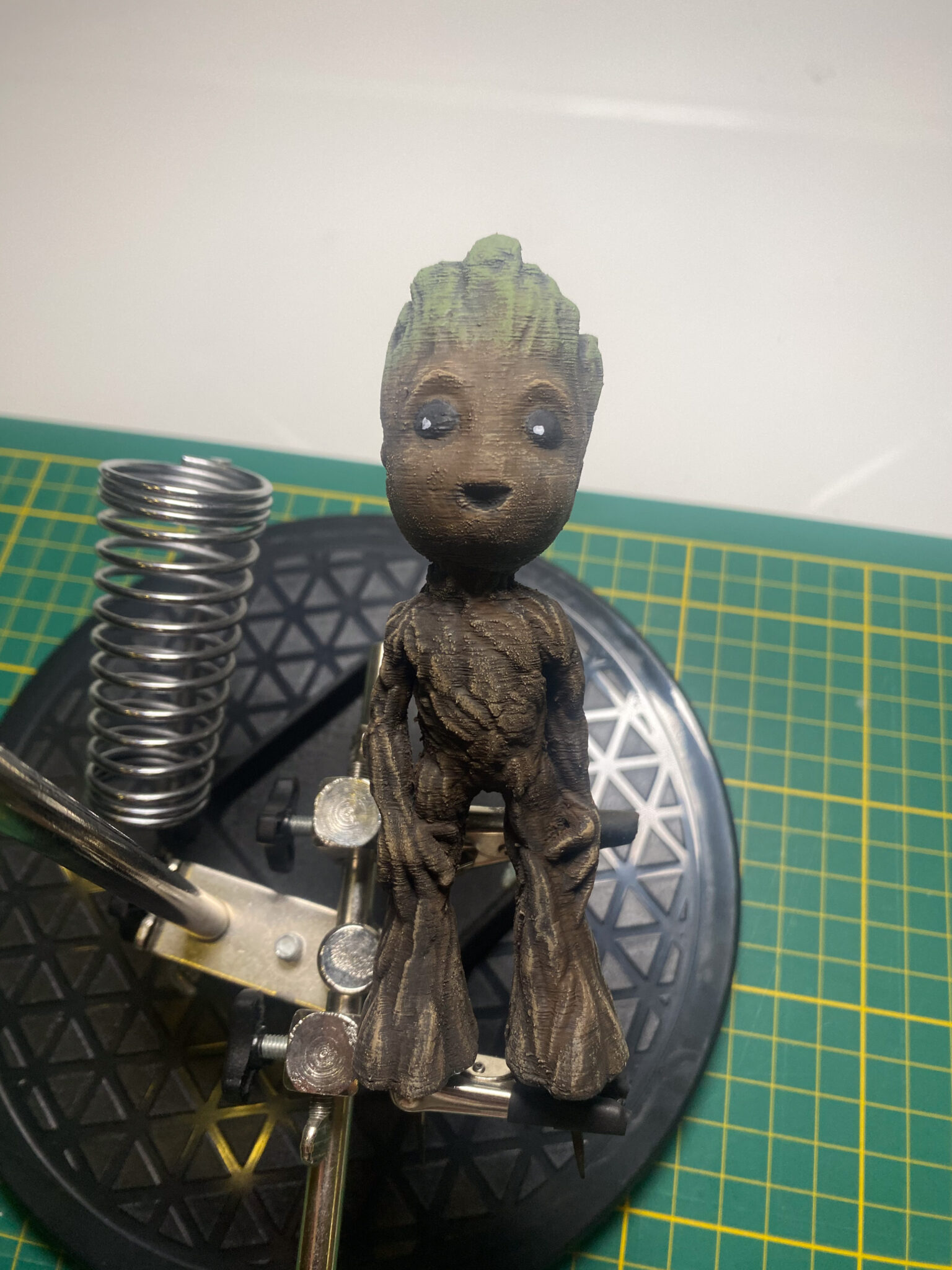 Also Spray-Box aufgebaut und den Kompressor angeworfen. Als Grundierung wählte ich Schwarz, um einen einheitlichen Untergrund zu erhalten. Nach dem Grundieren kam der kreative Teil: bemalt und abgebürstet mit verschiedenen Brauntönen und Oliv sowie normales Grün für die “Frisur”. Als letzter Schritt kam ein matter Klarlack für das gesamte Modell und glänzender Klarlack für die Augen, um ihnen einen realistischen Glanz zu verleihen.