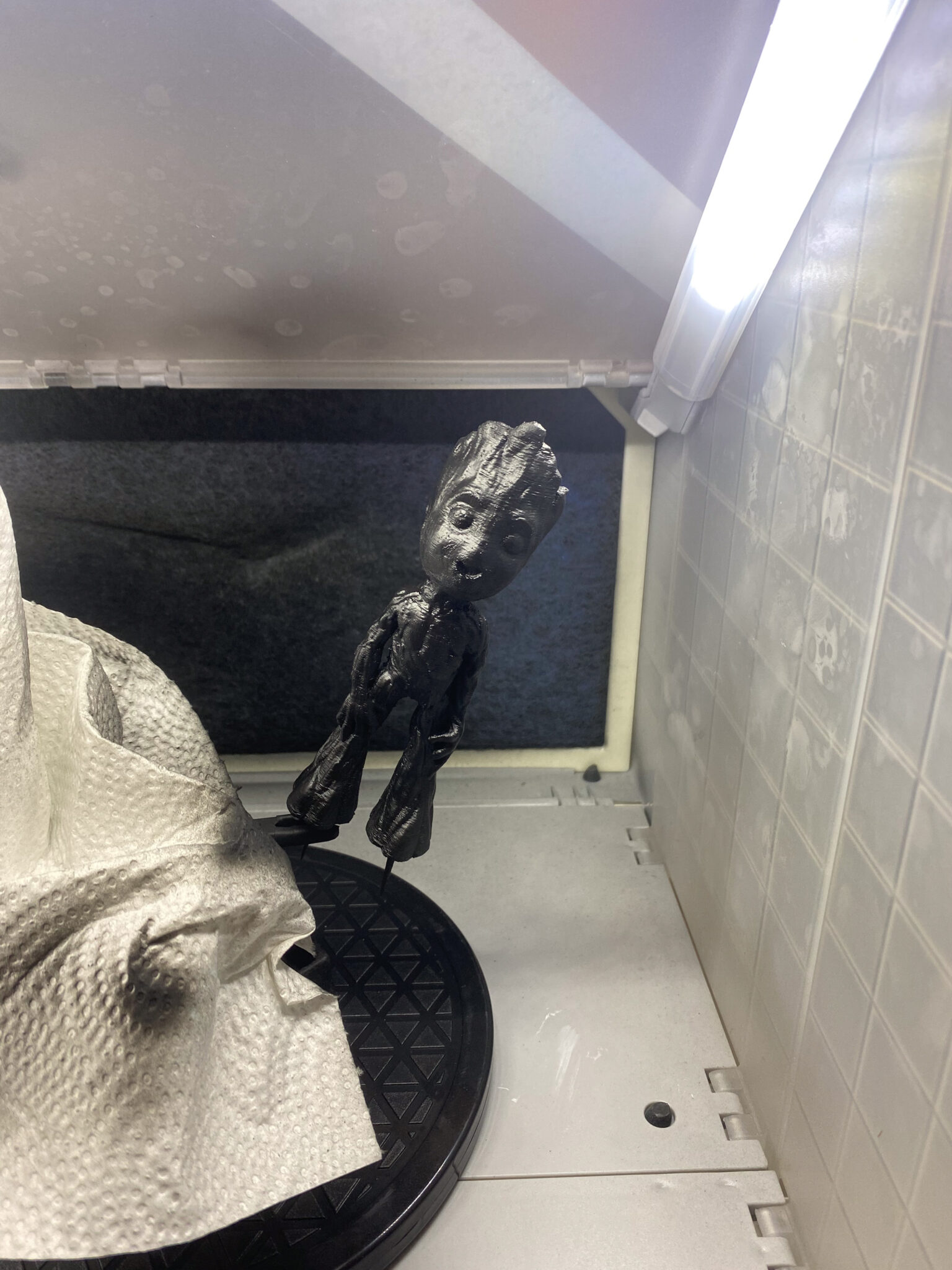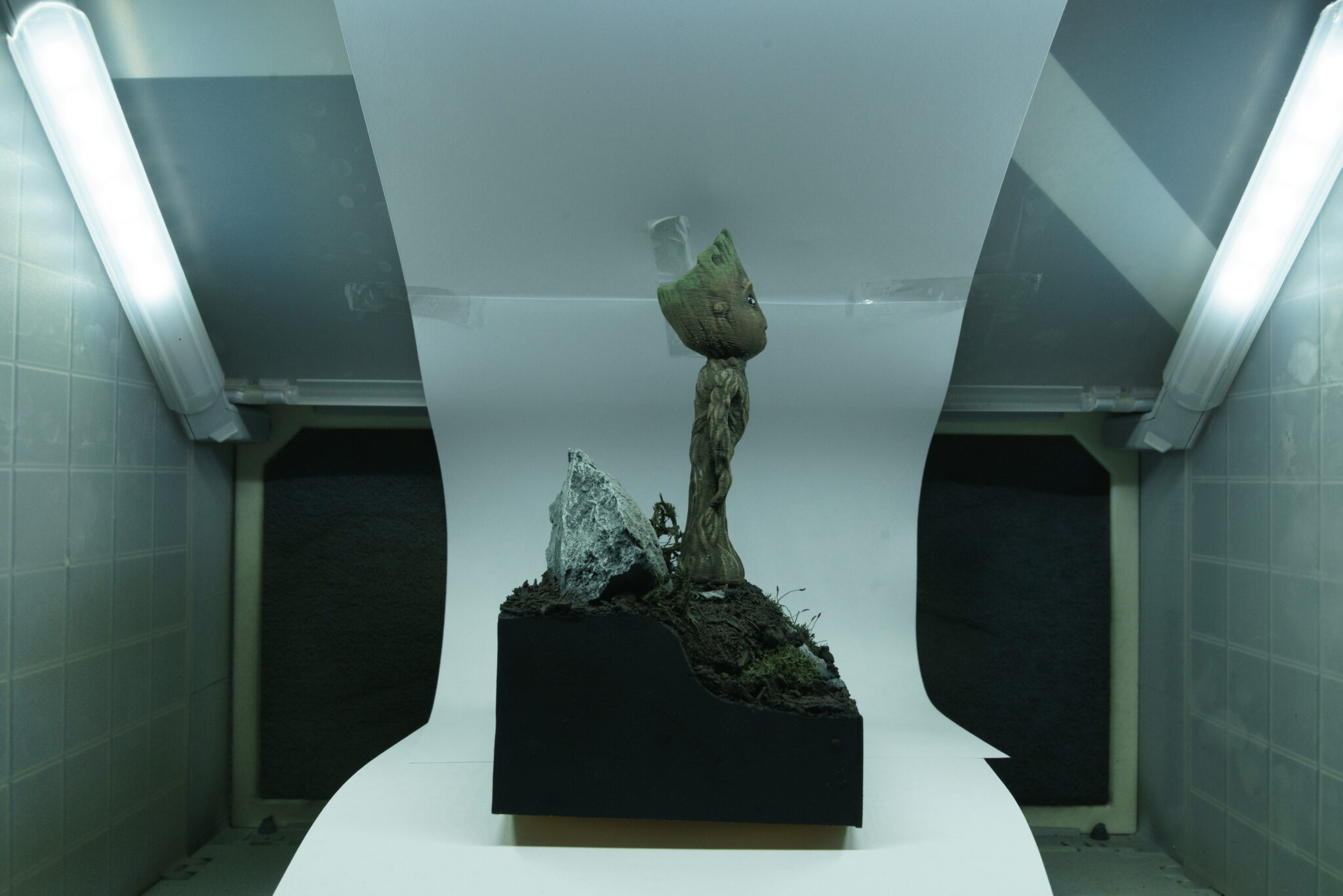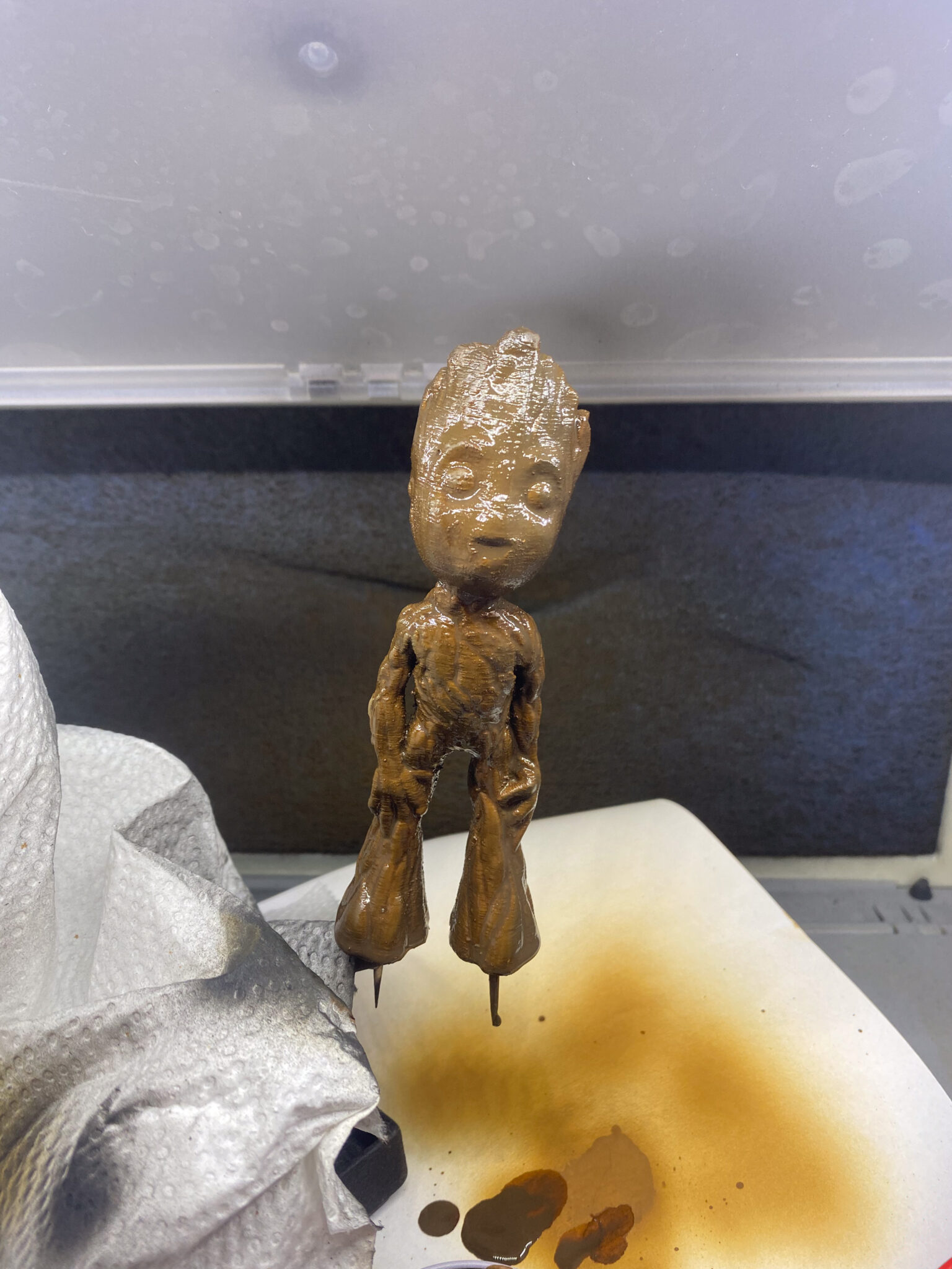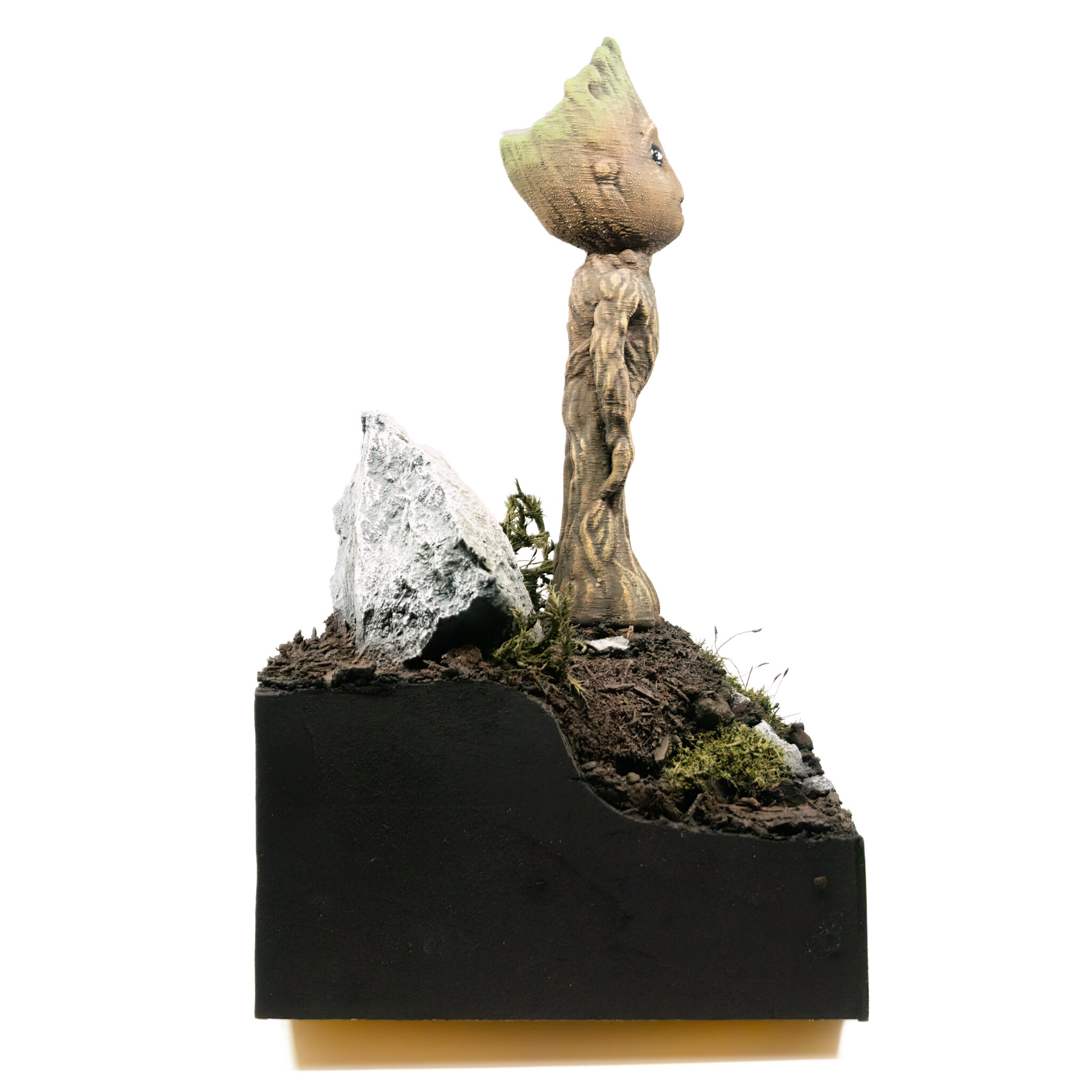 Also Spray-Box aufgebaut und den Kompressor angeworfen. Als Grundierung wählte ich Schwarz, um einen einheitlichen Untergrund zu erhalten. Nach dem Grundieren kam der kreative Teil: bemalt und abgebürstet mit verschiedenen Brauntönen und Oliv sowie normales Grün für die “Frisur”. Als letzter Schritt kam ein matter Klarlack für das gesamte Modell und glänzender Klarlack für die Augen, um ihnen einen realistischen Glanz zu verleihen.