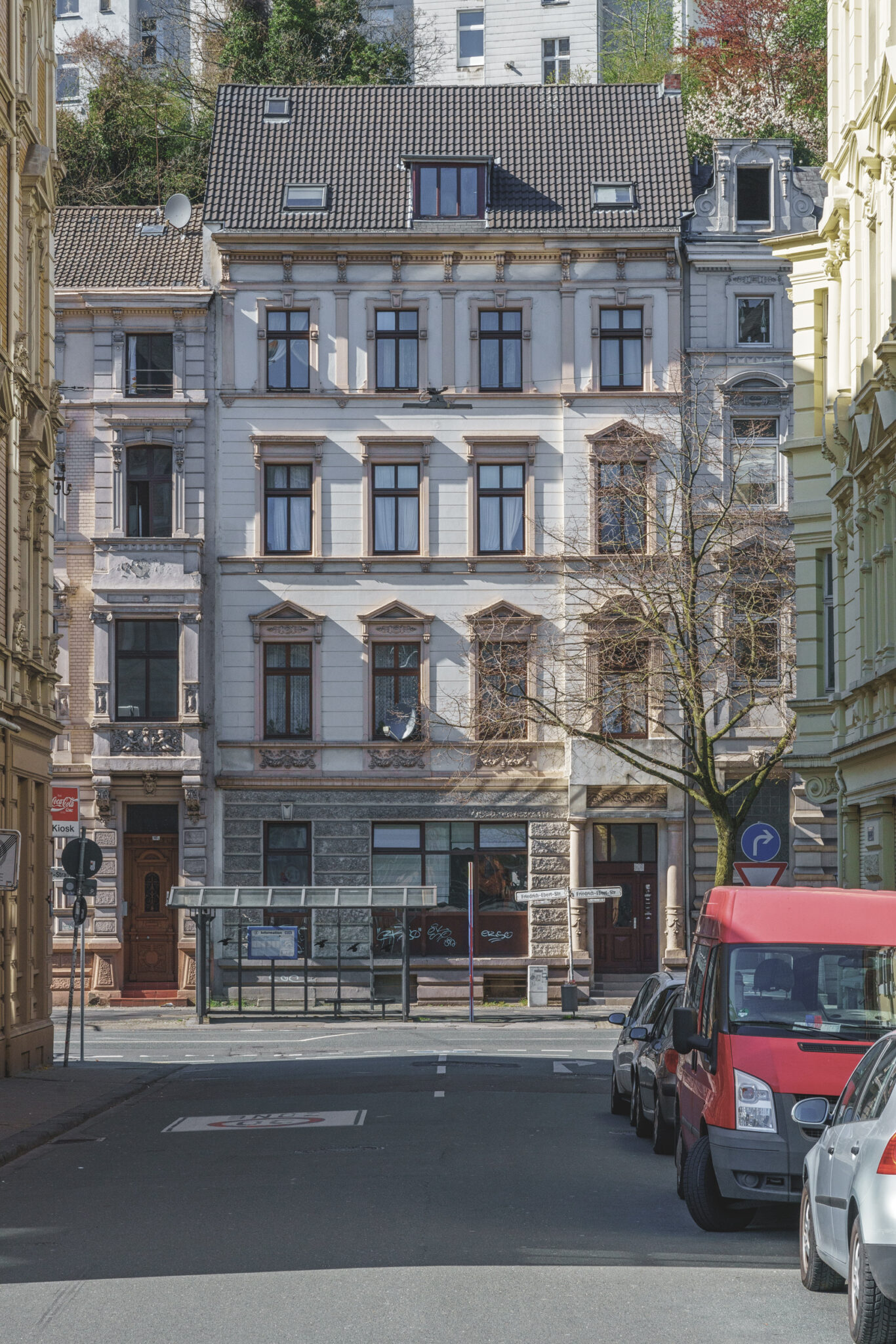 Unser erster Halt führte uns zur Schwebebahnstation Pestalozzistraße. Diese Station, die früher den Namen „Schillerbrücke“ trug, liegt am Rande des Wohnviertels Arrenberg und ist ein markanter Punkt im Stadtbild. Die umliegenden Gebäude, viele davon aus der Gründerzeit, stehen hier dicht gedrängt und erinnern an die Zeiten, als Wuppertal als Industrieknotenpunkt florierte. Die Pestalozzistraße, die einst das pulsierende Herzstück des Viertels war, wirkte an diesem Tag fast verlassen. Die majestätischen Fassaden der Häuser, die in der Stille noch beeindruckender wirkten, erinnerten an die glorreichen Zeiten, in denen Wuppertal eine bedeutende Industriestadt war. Das erste Bild zeigt die prächtigen Häuserfronten und gibt einen Eindruck davon, wie es sich anfühlte, durch diese stille, aber eindrucksvolle Straße zu schlendern.