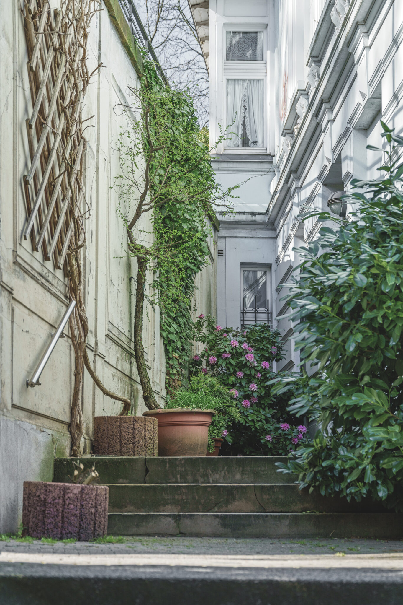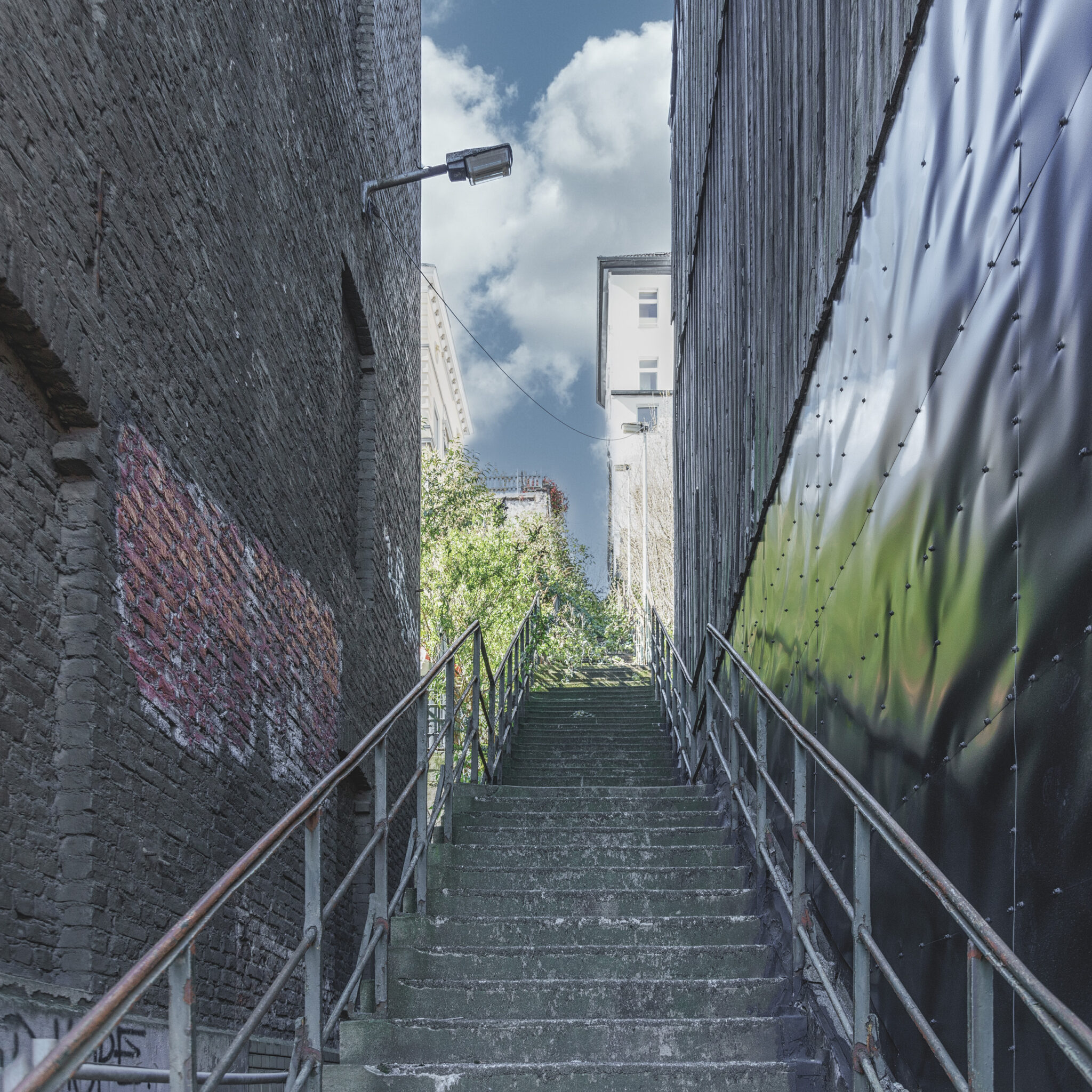 Unser ursprüngliches Ziel war die Jakobstreppe, auch bekannt als Himmelsleiter, die mit ihren 155 Stufen eine direkte Verbindung vom unteren Teil des Viertels zur Nützenberger Straße herstellt. Doch zu unserer Enttäuschung mussten wir feststellen, dass die Treppe aufgrund von Baufälligkeit gesperrt war. Diese Treppe, die 1887 erbaut wurde und heute als Baudenkmal gilt, war schon immer ein Symbol für den Aufstieg und die Mühsal, die das Leben in den steilen Hügeln Wuppertals mit sich bringt. Das vierte Bild zeigt die abgesperrte Treppe – ein stummer Zeuge der Herausforderungen, die auch eine Stadt wie Wuppertal immer wieder meistern muss.