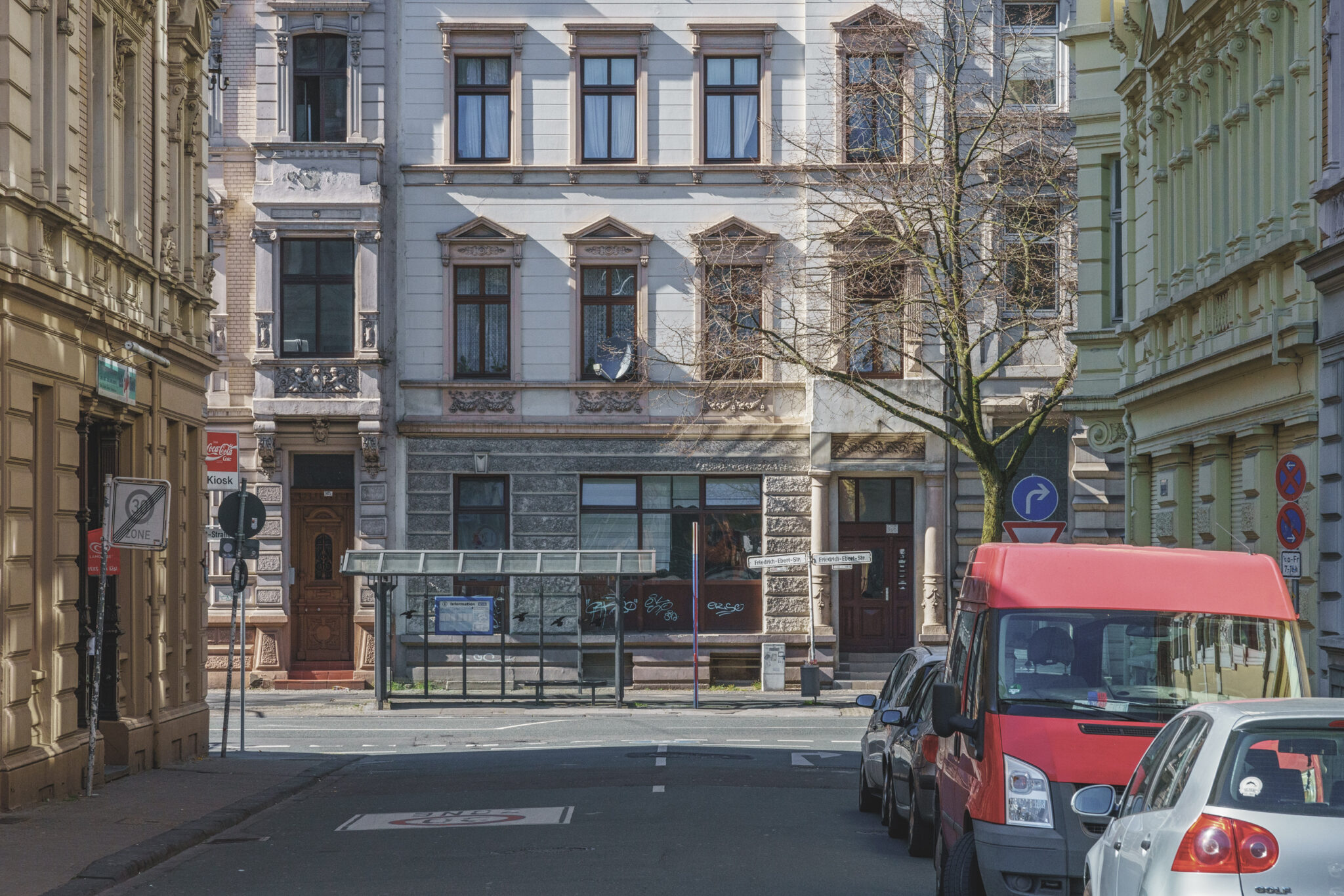 Von hier aus ging es weiter über die Friedrich-Ebert-Straße, die das Viertel Arrenberg durchzieht und zugleich eine der wichtigsten Verkehrsachsen der Stadt darstellt. Diese Straße, normalerweise eine belebte Hauptverkehrsader, war an diesem Tag fast menschenleer. Normalerweise pulsiert hier das Leben, doch heute vermittelte sie ein Gefühl von Stillstand und Ruhe. Die Leere, die auf der Friedrich-Ebert-Straße herrschte, erlaubte es uns, Details wahrzunehmen, die uns sonst entgangen wären.
