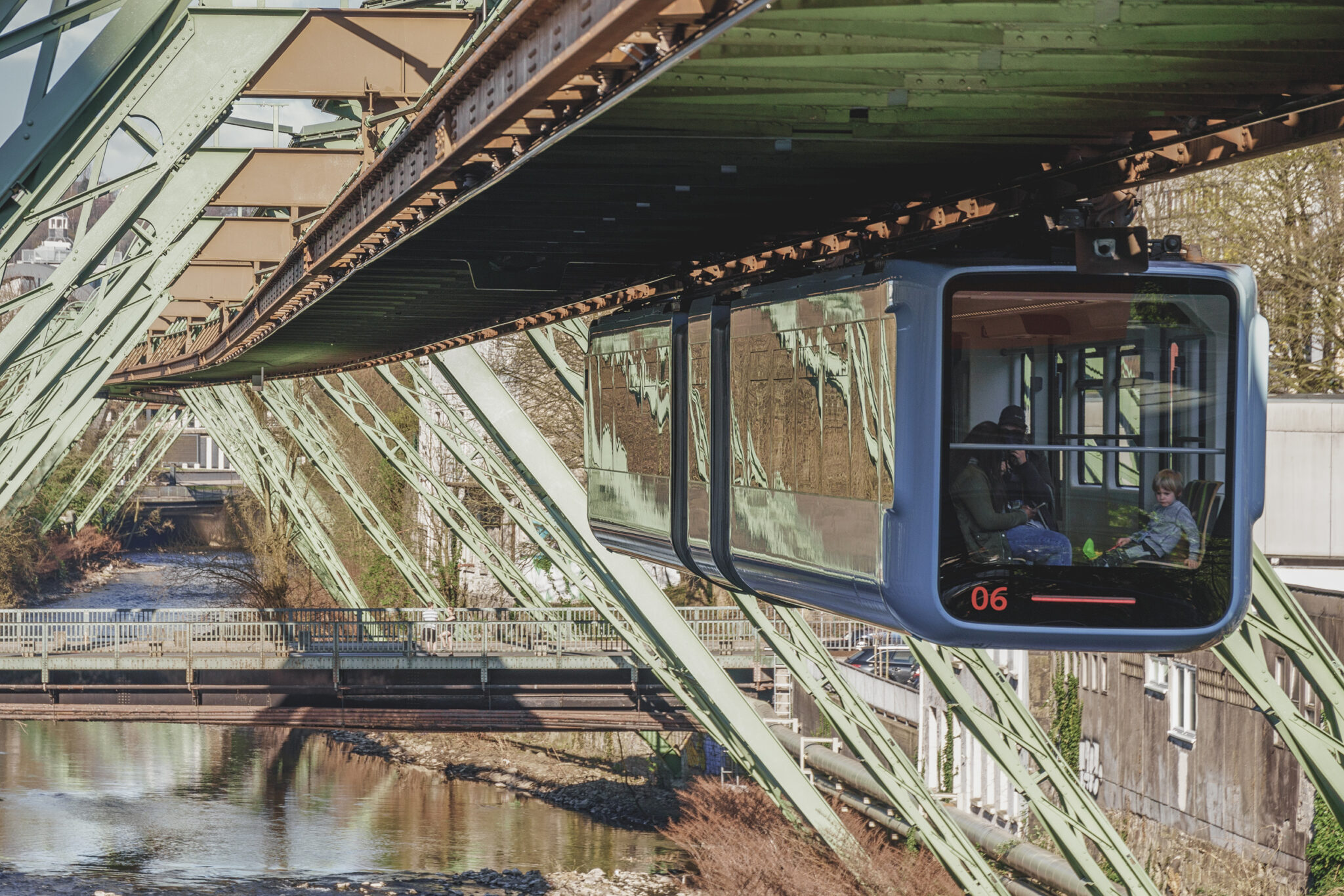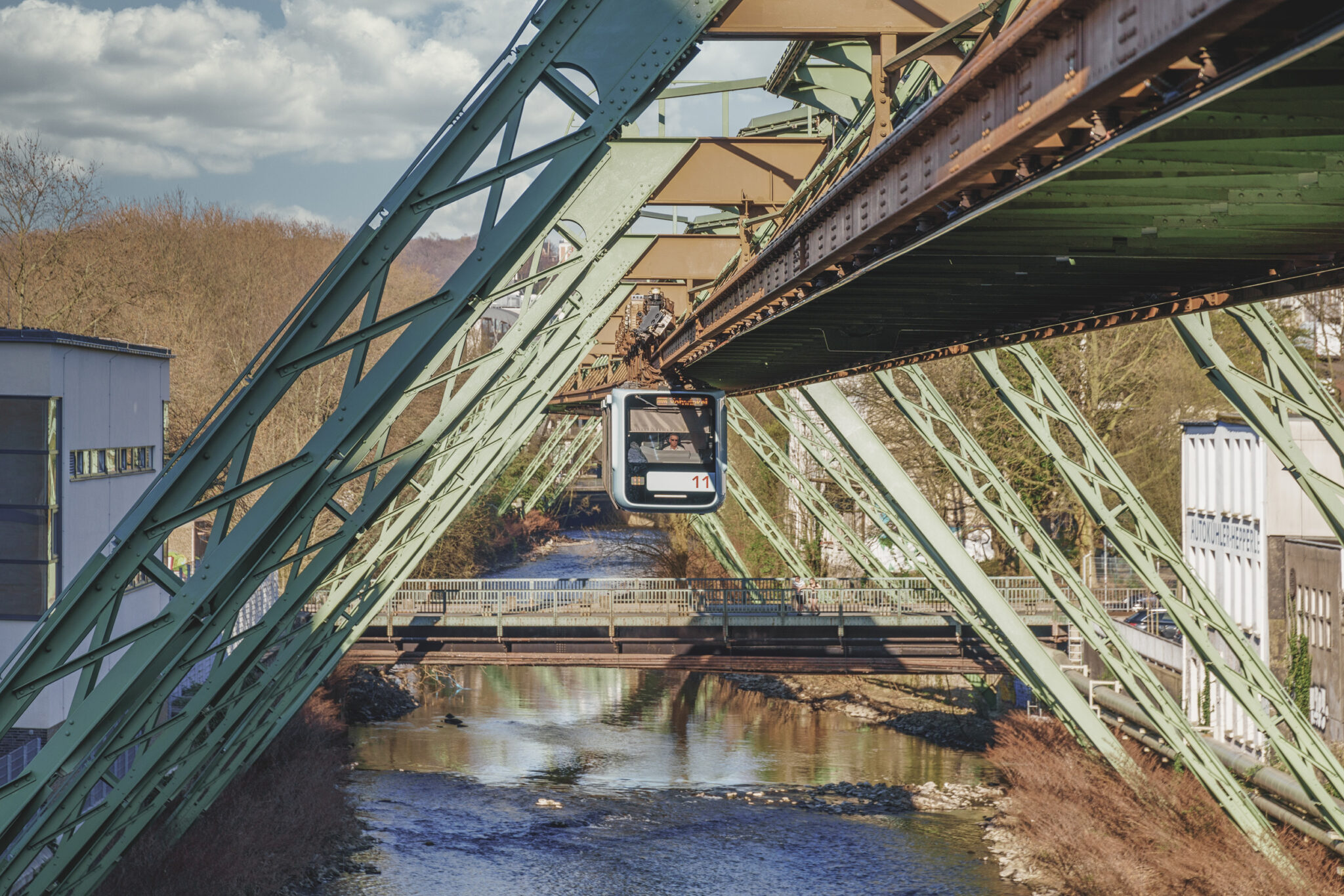 Unsere Erkundungstour endete schließlich am Robert-Daum-Platz, einer weiteren wichtigen Station auf unserer Route. Hier, inmitten des sonst so belebten Platzes, thronte die Schwebebahn, die sich majestätisch über die Wupper schwang. Diese ikonische Bahn, die seit ihrer Inbetriebnahme im Jahr 1901 ein Symbol für Wuppertal ist, schwebte heute fast gespenstisch ruhig über den Fluss. Die Schwebebahn war Zeuge zahlreicher Veränderungen in der Stadt und stand auch an diesem Tag als Symbol für Beständigkeit und Wandel zugleich. Auf dem sechsten Bild sieht man die Schwebebahn in ihrer ganzen Pracht – ein Sinnbild für die Beständigkeit, die uns durch diese ungewöhnlichen Zeiten trug.