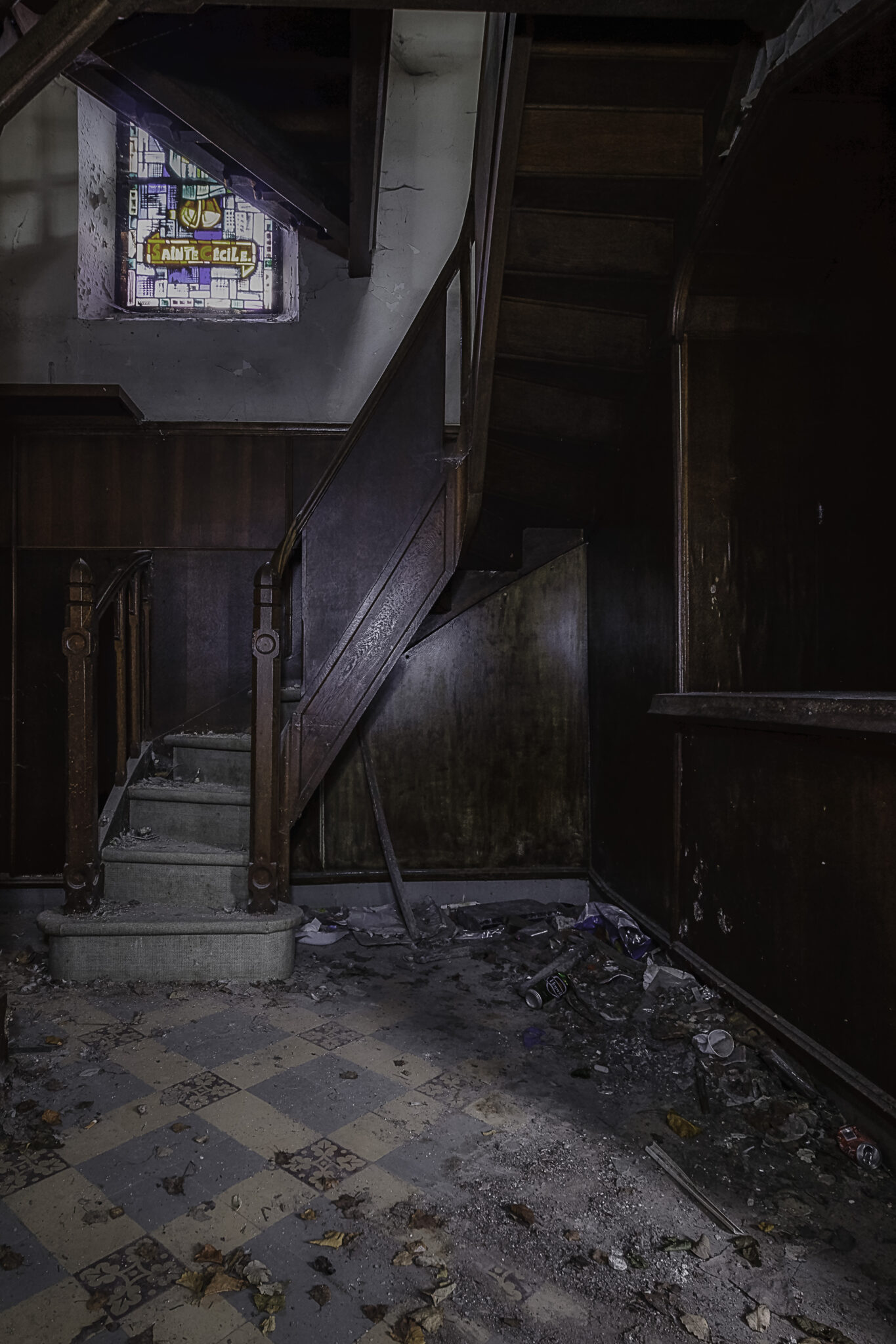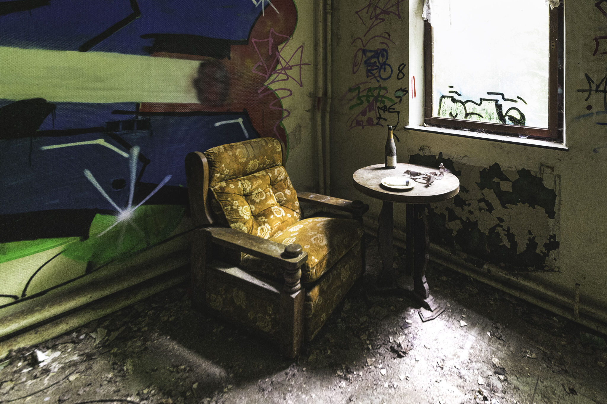 Das Innere der Kapelle war ein schockierender Kontrast. Die bunten Glasfenster, einst kunstvoll gestaltet, ließen farbiges Licht in den verfallenen Raum strömen. Doch wo einst Bänke standen, lagen nun Trümmer und Graffiti – eine verstörende Mischung aus Sakralem und Profanem. In einer Ecke des Anbaus stand ein verlassener Sessel, ein Symbol menschlicher Spuren in einem Raum, der eigentlich der Spiritualität gehörte. Es war bedrückend und faszinierend zugleich.