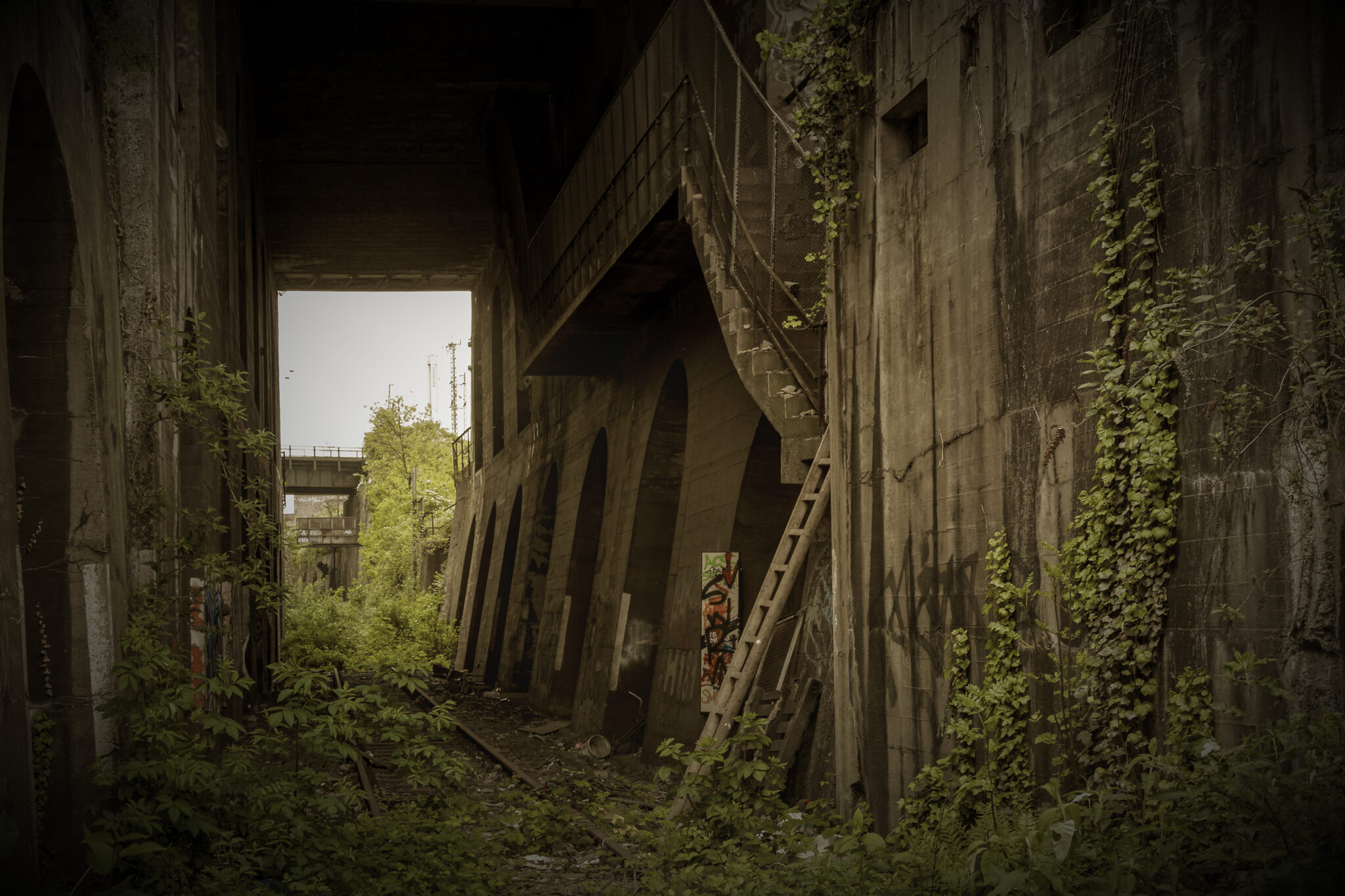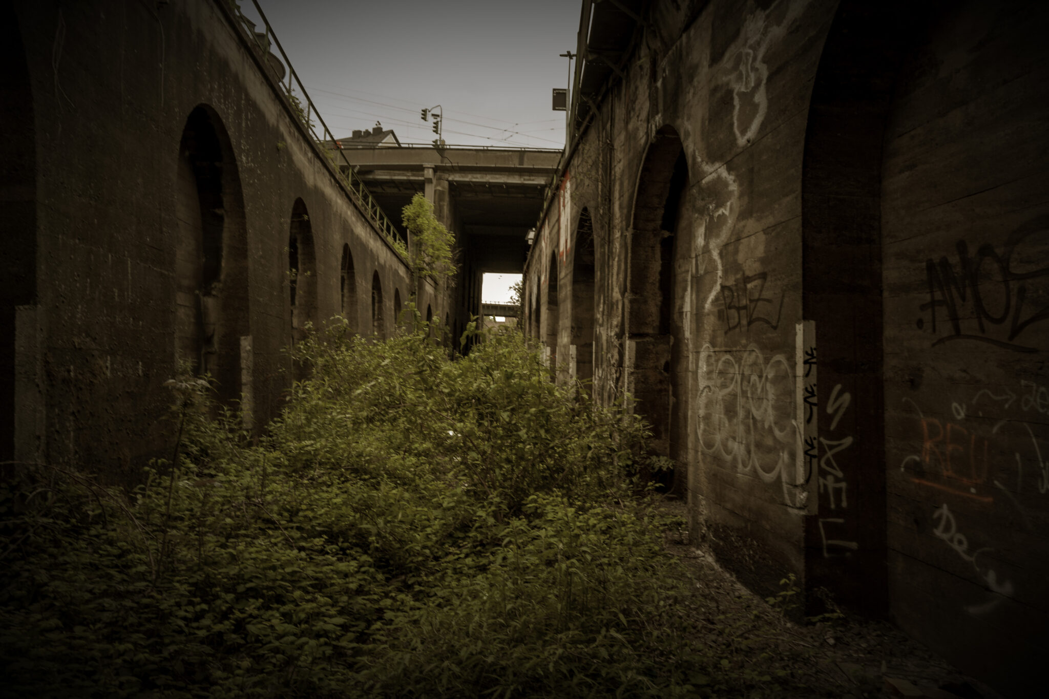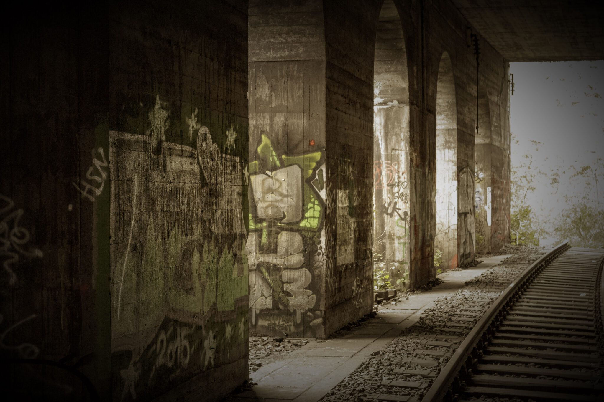 Der Zugang zu diesem verborgenen Relikt war unscheinbar und unspektakulär. Doch je tiefer ich in diese Welt aus Beton und Gestrüpp vordrang, desto mehr verstummte die Welt um mich herum. Eine fast greifbare Stille breitete sich aus, durchbrochen nur vom fernen Echo eines vorbeiziehenden Zuges. Besonders prägend war ein monumentales Jesus-Graffiti, das unter einem der Betonbögen thronte. Die künstlerische Darstellung wirkte wie ein stiller Segen für diesen geheimnisvollen Ort, während die Natur unaufhaltsam begann, die steinernen Mauern und eisernen Schienen in ihr Reich zurückzuholen. Grünes Blattwerk und zarte Ranken schienen hier genauso Teil der Geschichte zu sein wie der rostige Stahl.