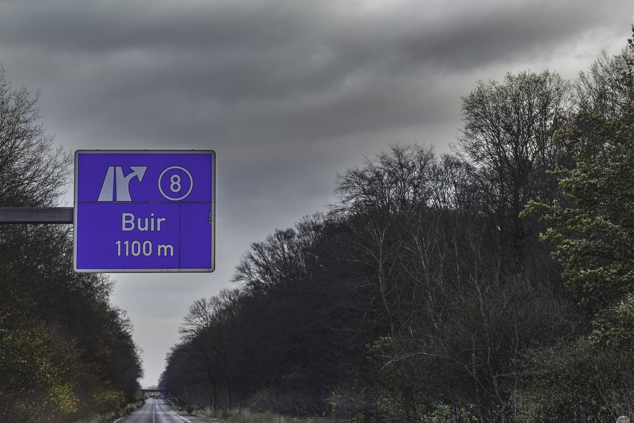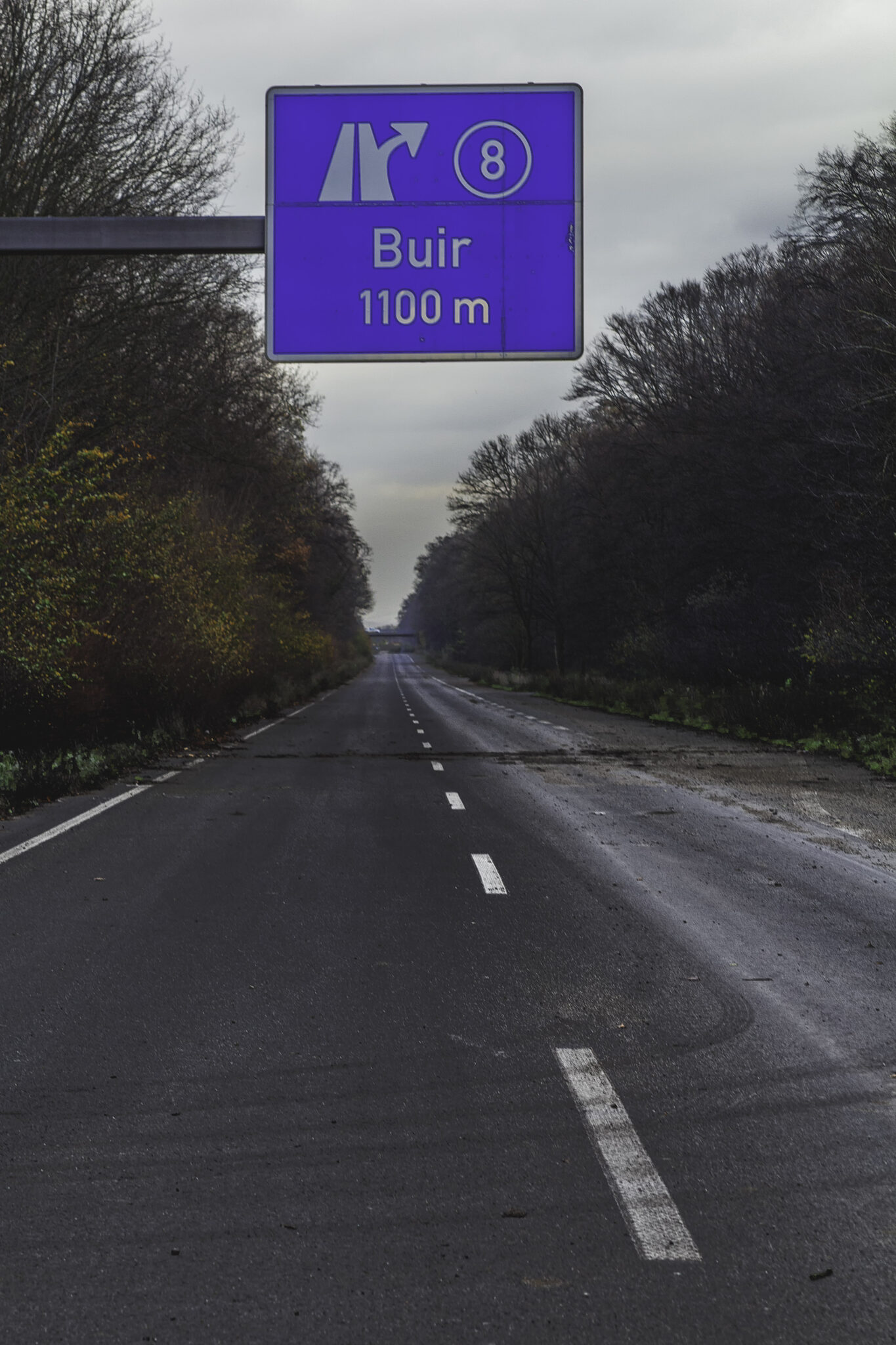 Bereits bei der Annäherung fällt das große blaue Autobahnschild ins Auge: „Ausfahrt Buir – 1100 m“. Doch statt Verkehr herrscht hier unheimliche Ruhe. Die Fahrbahn, einst glatt und von Tausenden Reifen gezeichnet, zeigt heute deutliche Spuren der Natur. Innerhalb weniger Jahre nach der Stilllegung begann die Natur, den Raum zurückzuerobern, und mittlerweile bedecken Moose, Gräser und junge Bäume weite Teile der ehemaligen Asphaltfläche.