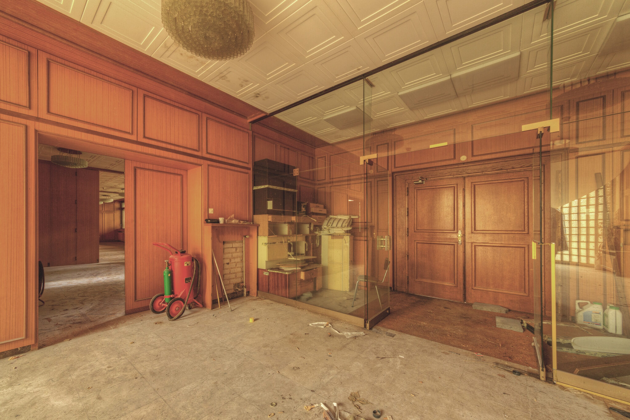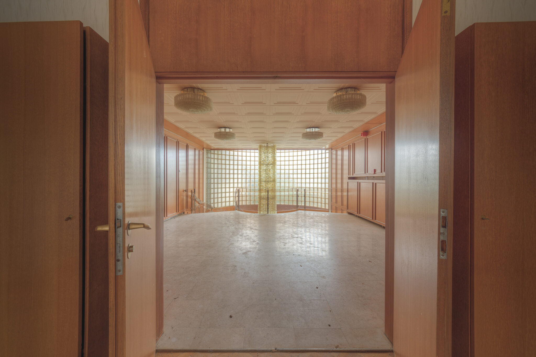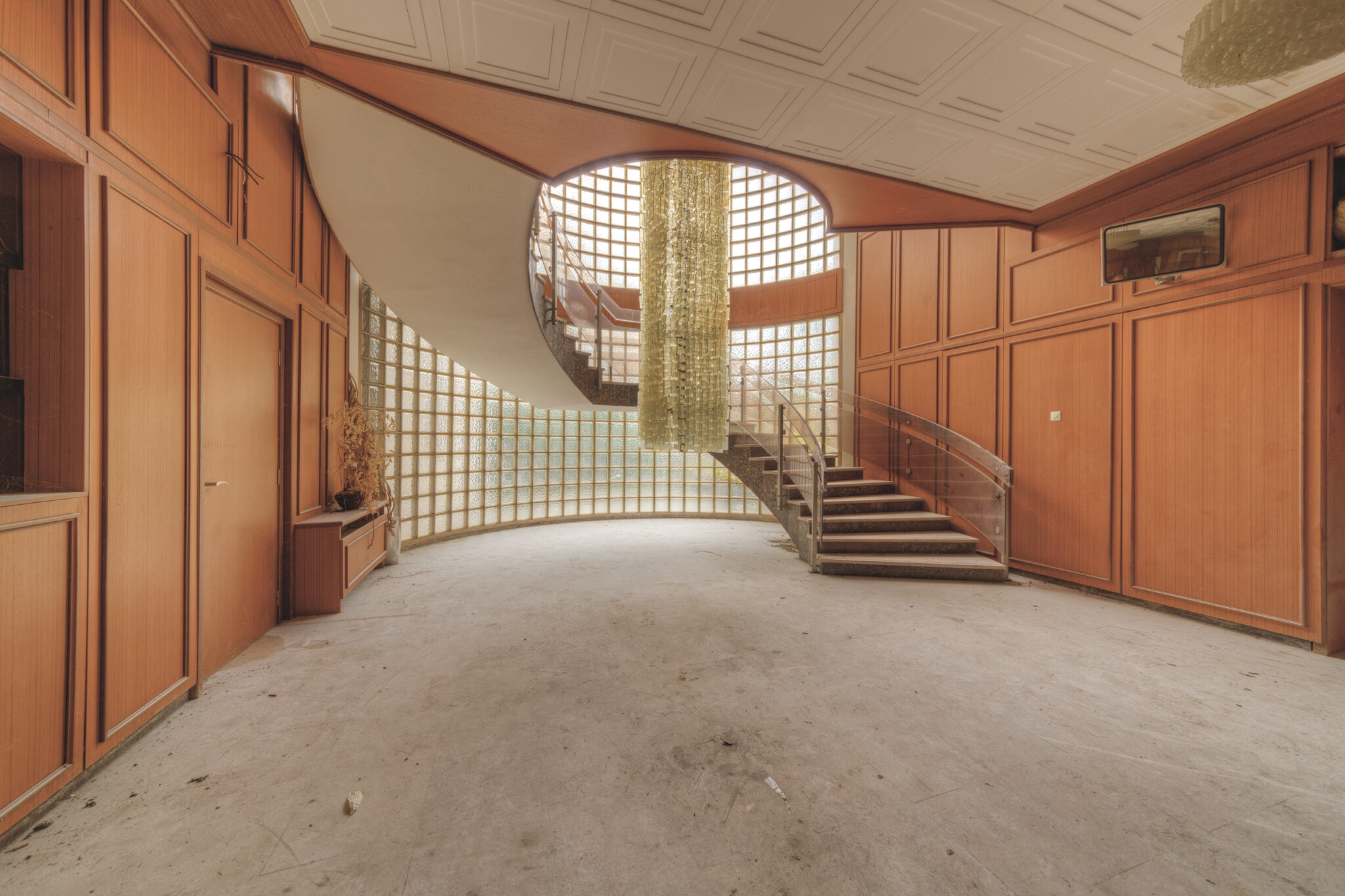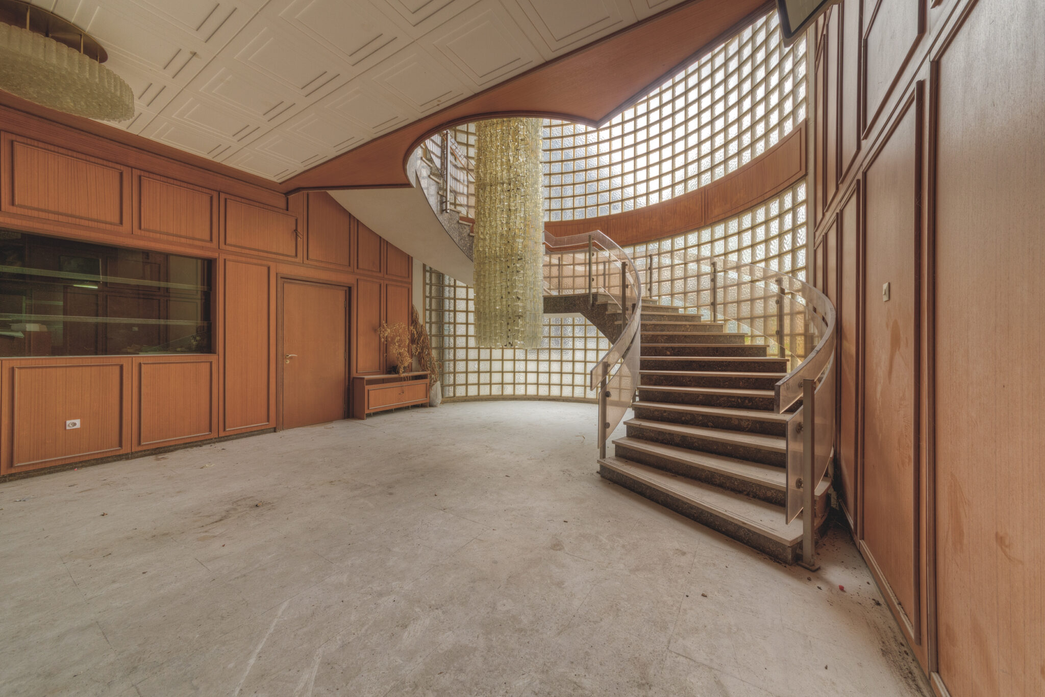 Der erste Blick in das Innere der Residenz ließ mich innehalten. Es war, als ob die Zeit hier stehen geblieben wäre. Ein majestätisches Treppenhaus, das einst Gäste und Diplomaten in Empfang nahm, war nun verstaubt und vernachlässigt. Die gläsernen Bausteine, die das Licht in das Foyer streuten, wirkten wie ein Relikt aus einer vergangenen Ära. Der prunkvolle Kronleuchter, der von der Decke hing, war ebenfalls ein stiller Zeuge der einstigen Pracht. In einem der Räume stand ein Schreibtisch, auf dem eine Schreibmaschine zurückgelassen wurde – ein Symbol der Bürokratie, die einst hier herrschte.