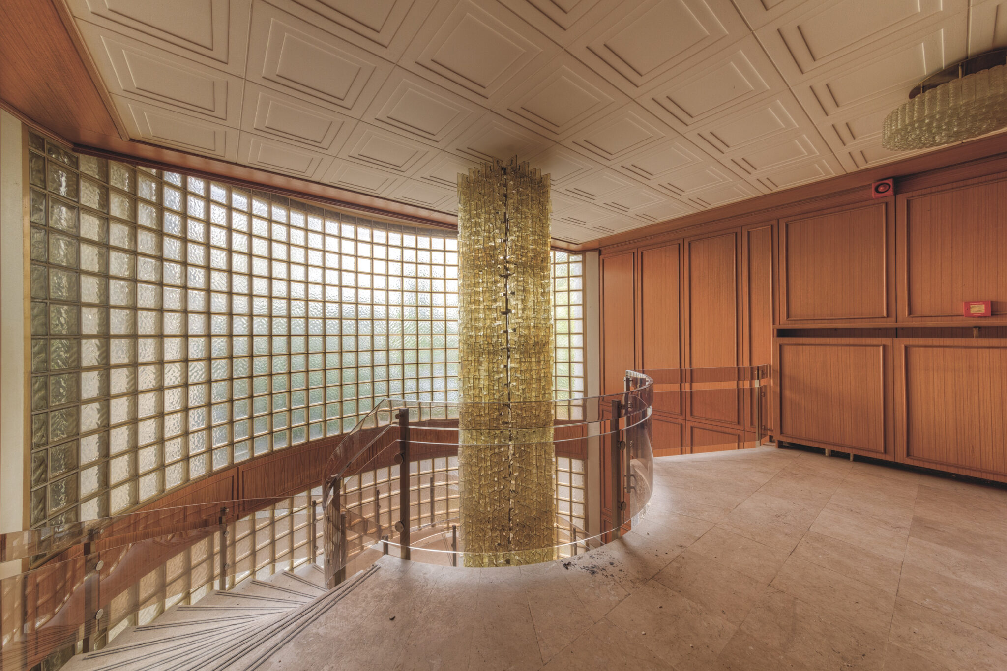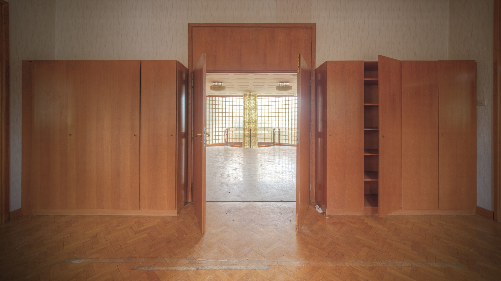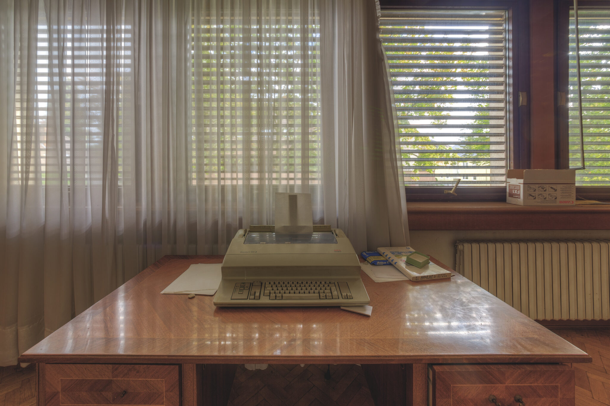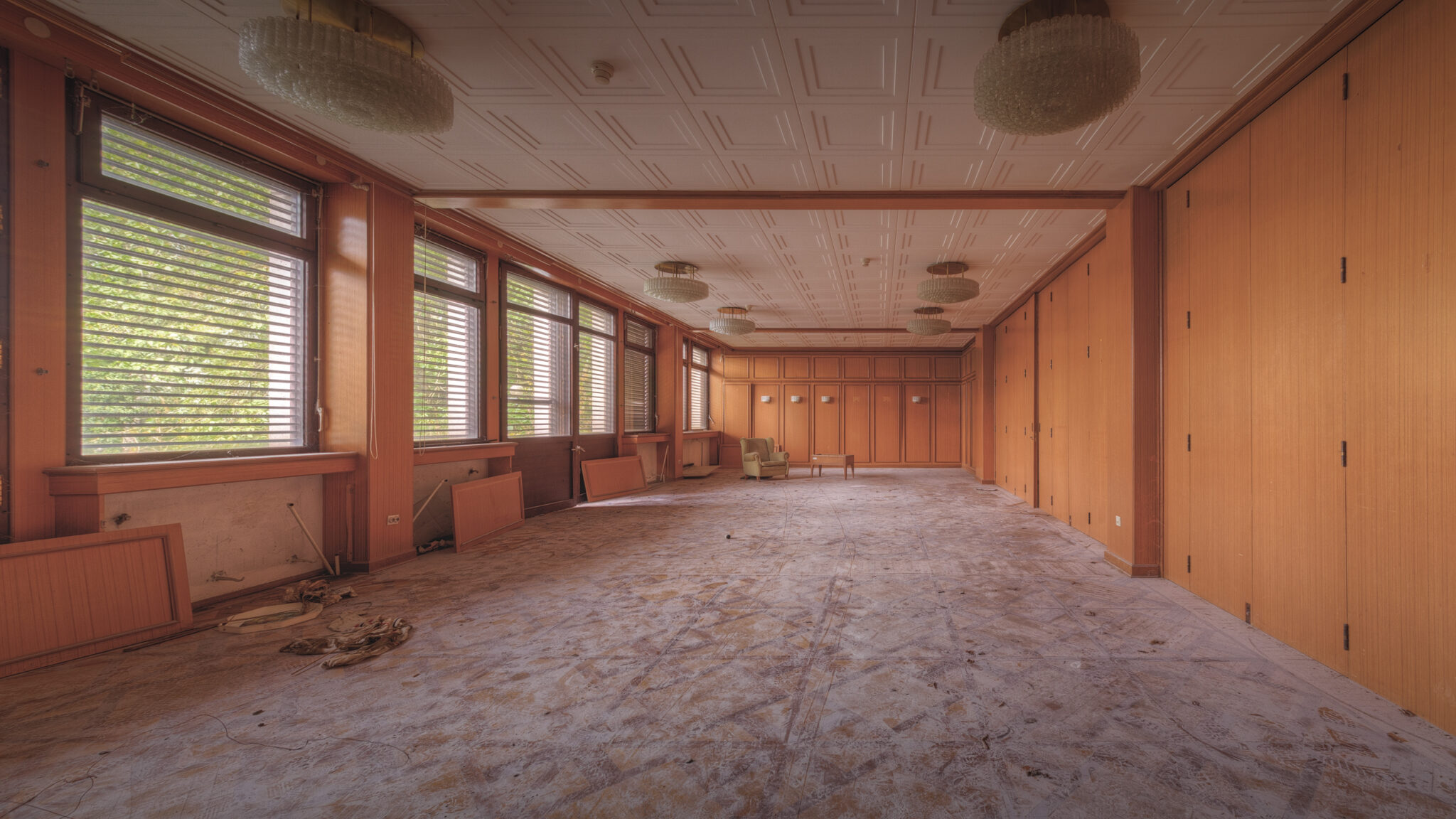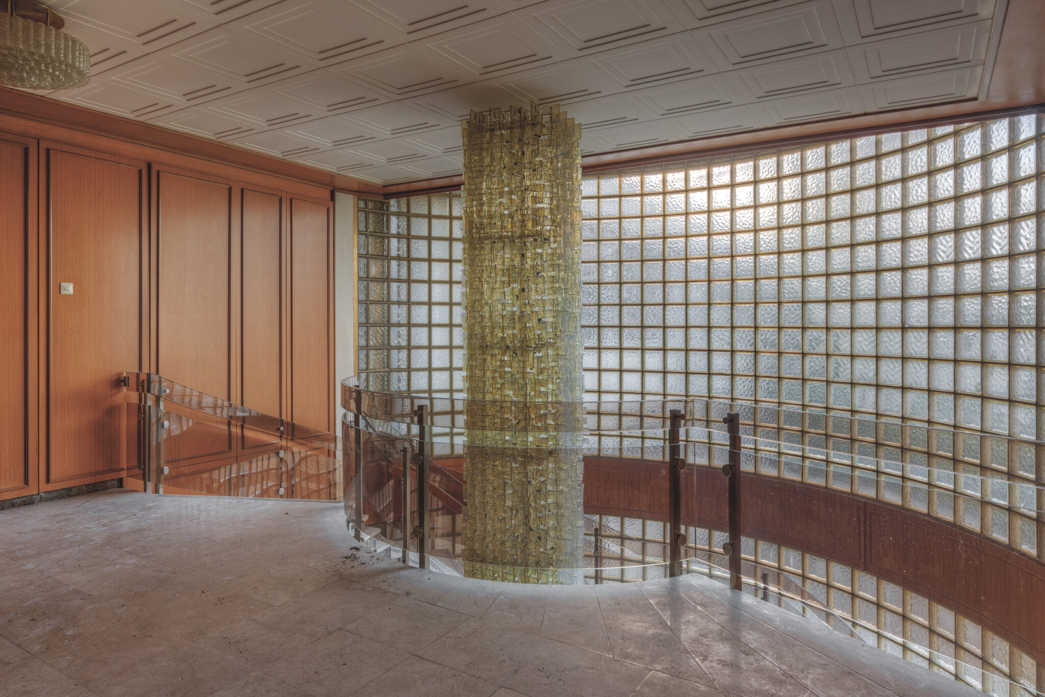 Der erste Blick in das Innere der Residenz ließ mich innehalten. Es war, als ob die Zeit hier stehen geblieben wäre. Ein majestätisches Treppenhaus, das einst Gäste und Diplomaten in Empfang nahm, war nun verstaubt und vernachlässigt. Die gläsernen Bausteine, die das Licht in das Foyer streuten, wirkten wie ein Relikt aus einer vergangenen Ära. Der prunkvolle Kronleuchter, der von der Decke hing, war ebenfalls ein stiller Zeuge der einstigen Pracht. In einem der Räume stand ein Schreibtisch, auf dem eine Schreibmaschine zurückgelassen wurde – ein Symbol der Bürokratie, die einst hier herrschte.