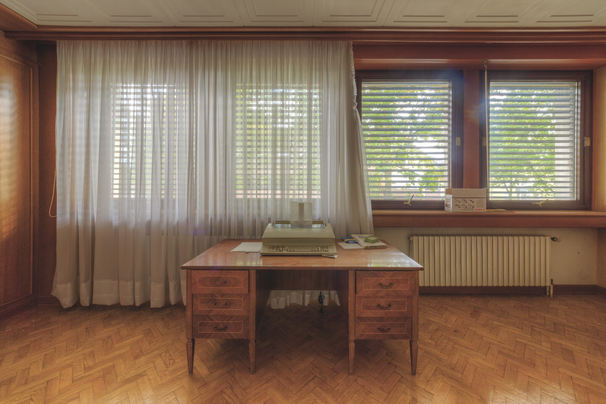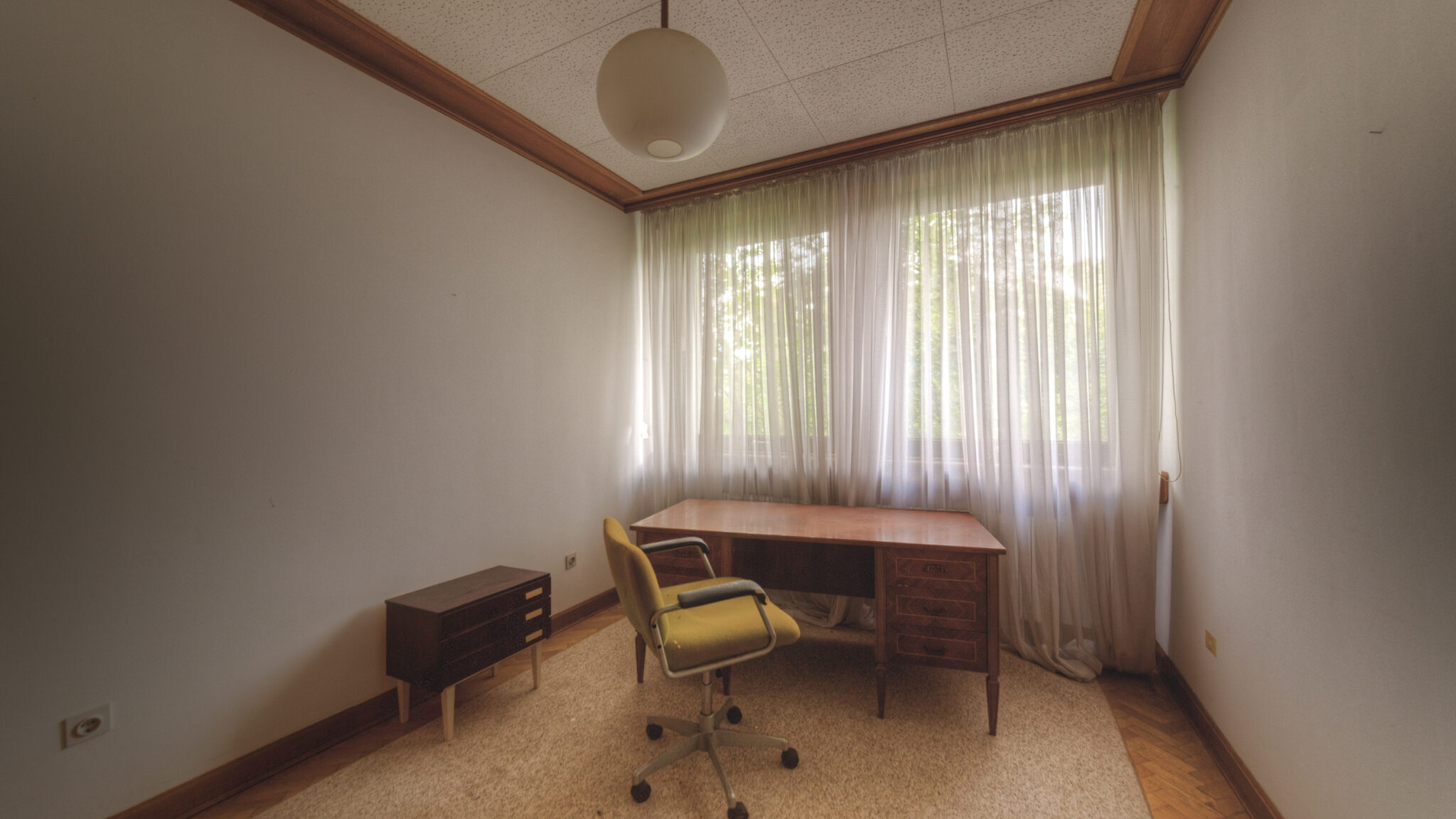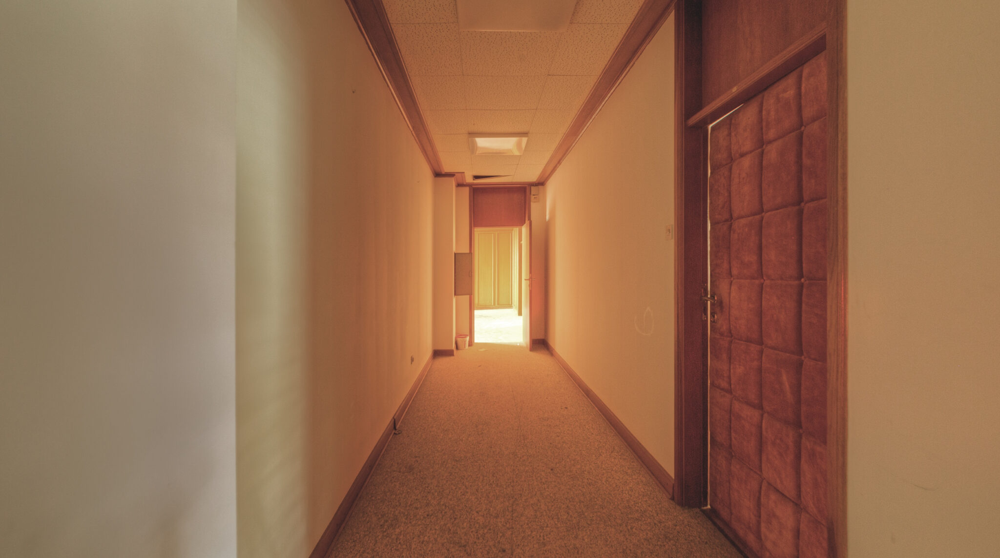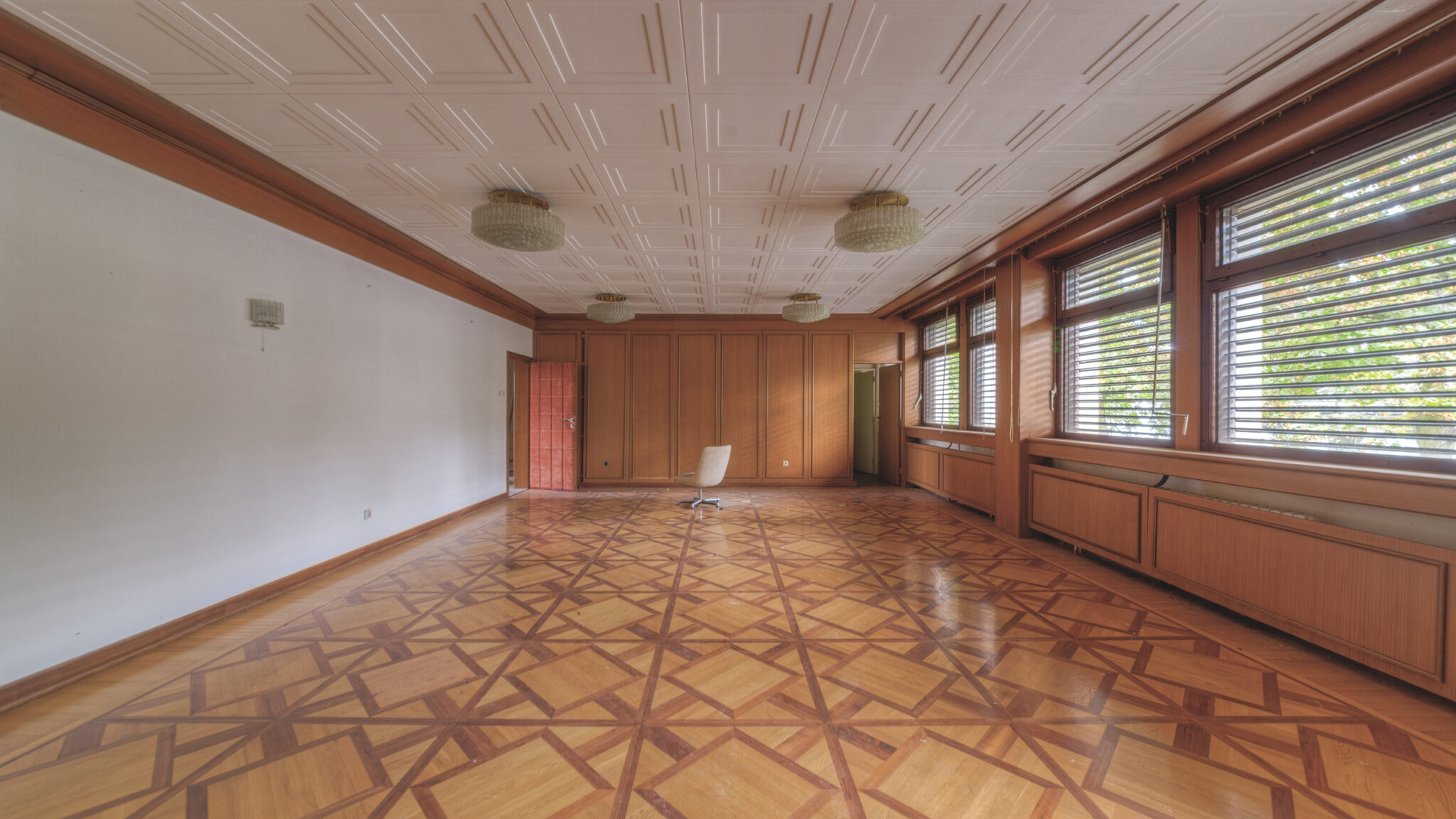 Der erste Blick in das Innere der Residenz ließ mich innehalten. Es war, als ob die Zeit hier stehen geblieben wäre. Ein majestätisches Treppenhaus, das einst Gäste und Diplomaten in Empfang nahm, war nun verstaubt und vernachlässigt. Die gläsernen Bausteine, die das Licht in das Foyer streuten, wirkten wie ein Relikt aus einer vergangenen Ära. Der prunkvolle Kronleuchter, der von der Decke hing, war ebenfalls ein stiller Zeuge der einstigen Pracht. In einem der Räume stand ein Schreibtisch, auf dem eine Schreibmaschine zurückgelassen wurde – ein Symbol der Bürokratie, die einst hier herrschte.