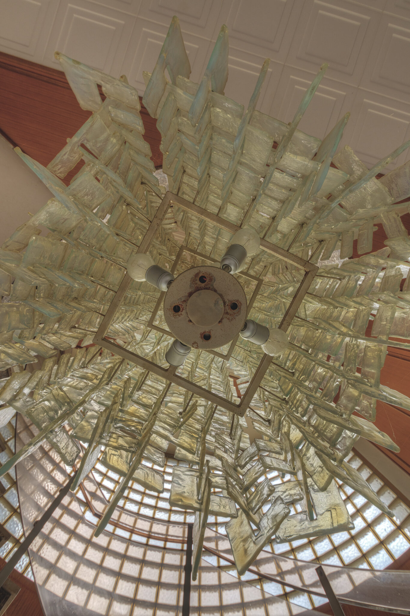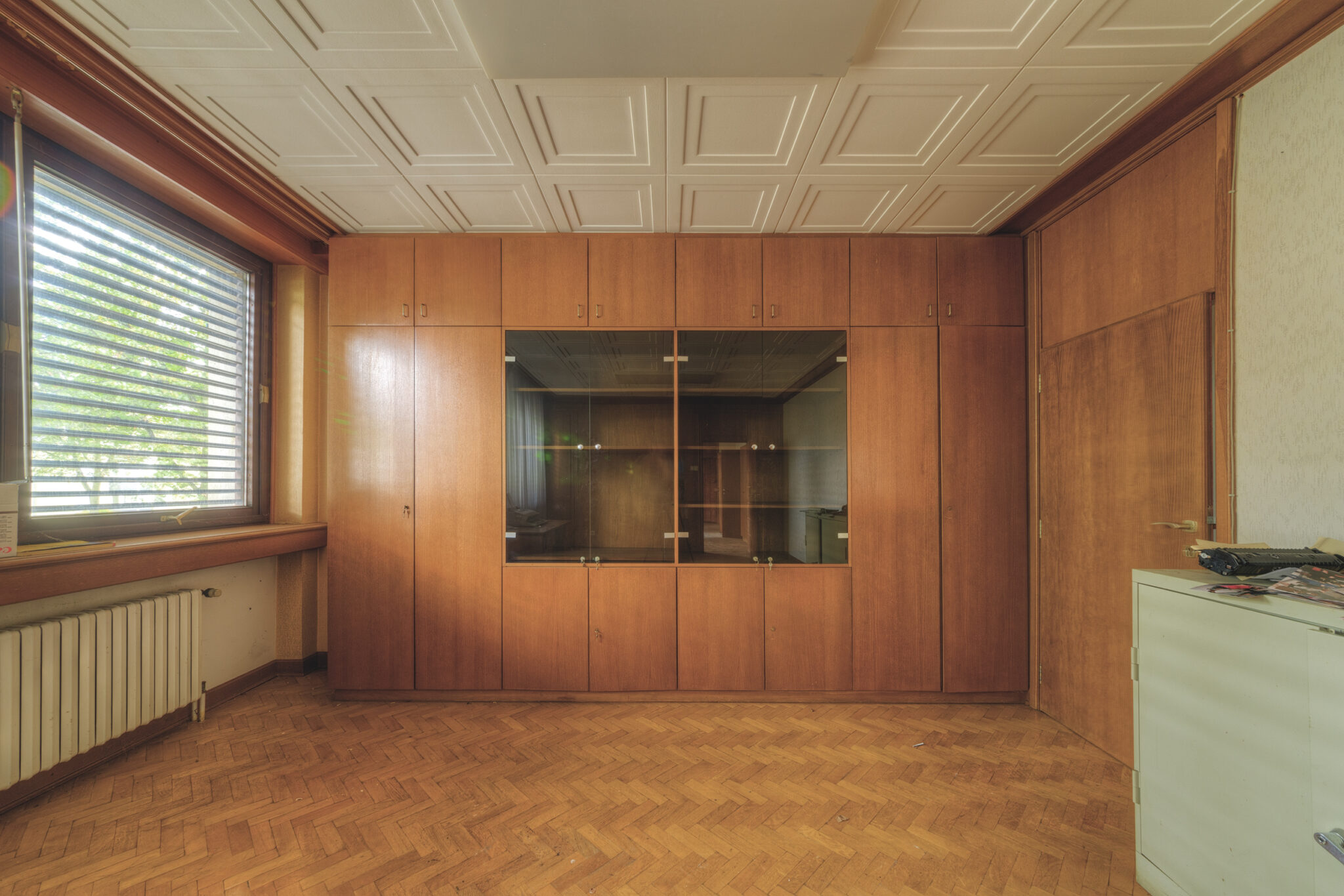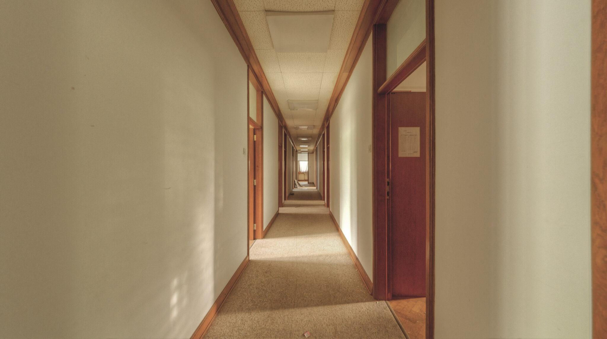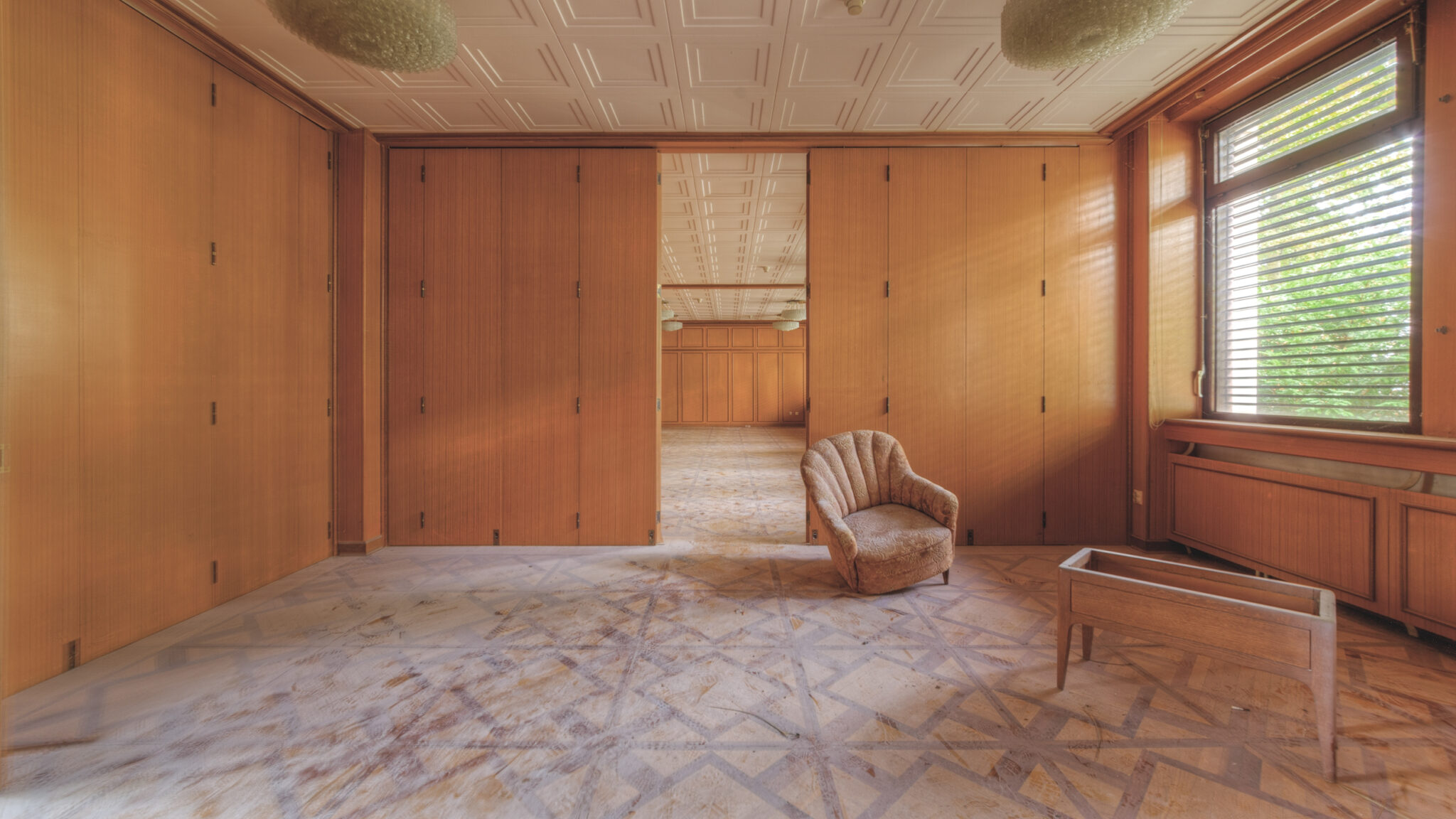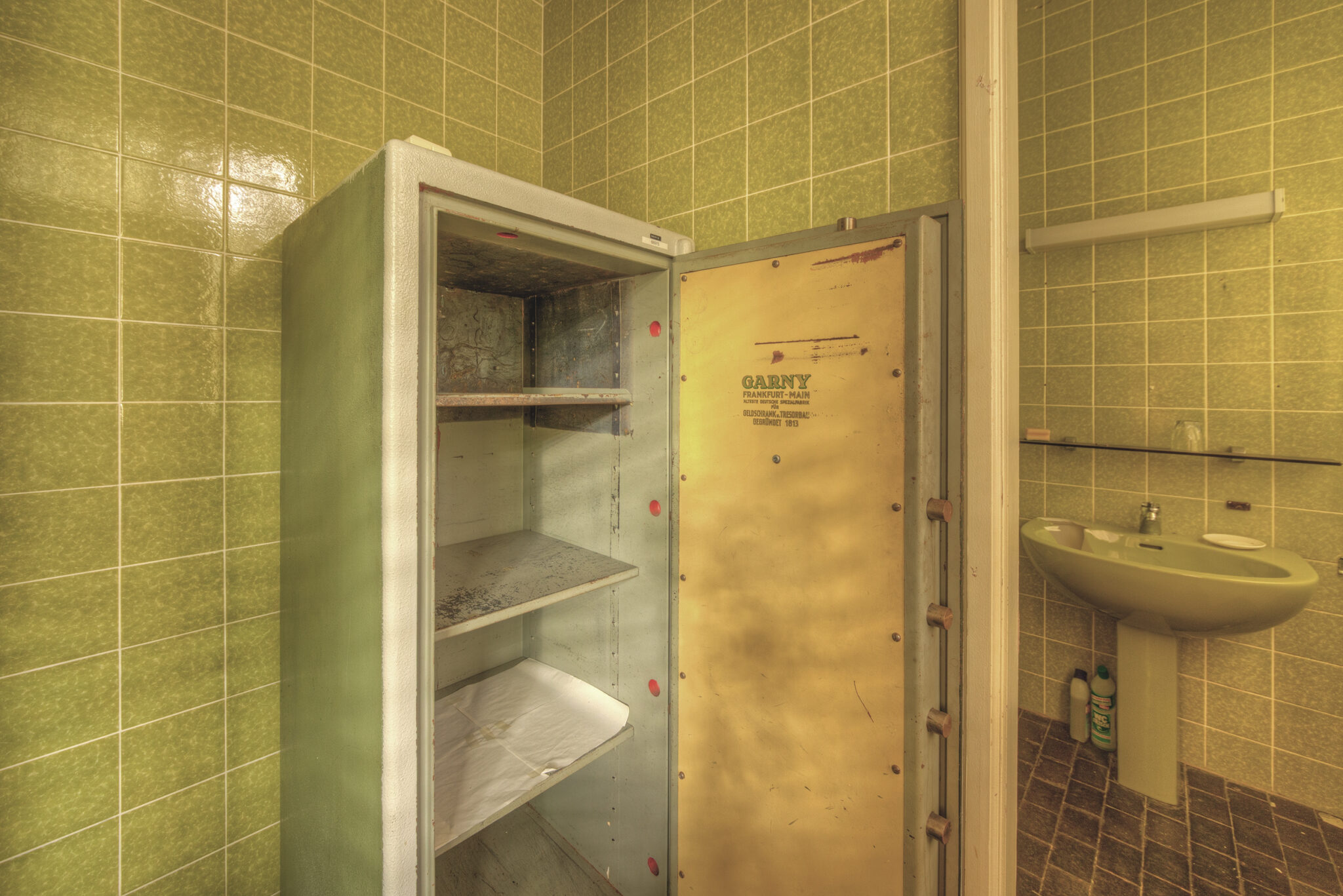 Der erste Blick in das Innere der Residenz ließ mich innehalten. Es war, als ob die Zeit hier stehen geblieben wäre. Ein majestätisches Treppenhaus, das einst Gäste und Diplomaten in Empfang nahm, war nun verstaubt und vernachlässigt. Die gläsernen Bausteine, die das Licht in das Foyer streuten, wirkten wie ein Relikt aus einer vergangenen Ära. Der prunkvolle Kronleuchter, der von der Decke hing, war ebenfalls ein stiller Zeuge der einstigen Pracht. In einem der Räume stand ein Schreibtisch, auf dem eine Schreibmaschine zurückgelassen wurde – ein Symbol der Bürokratie, die einst hier herrschte.