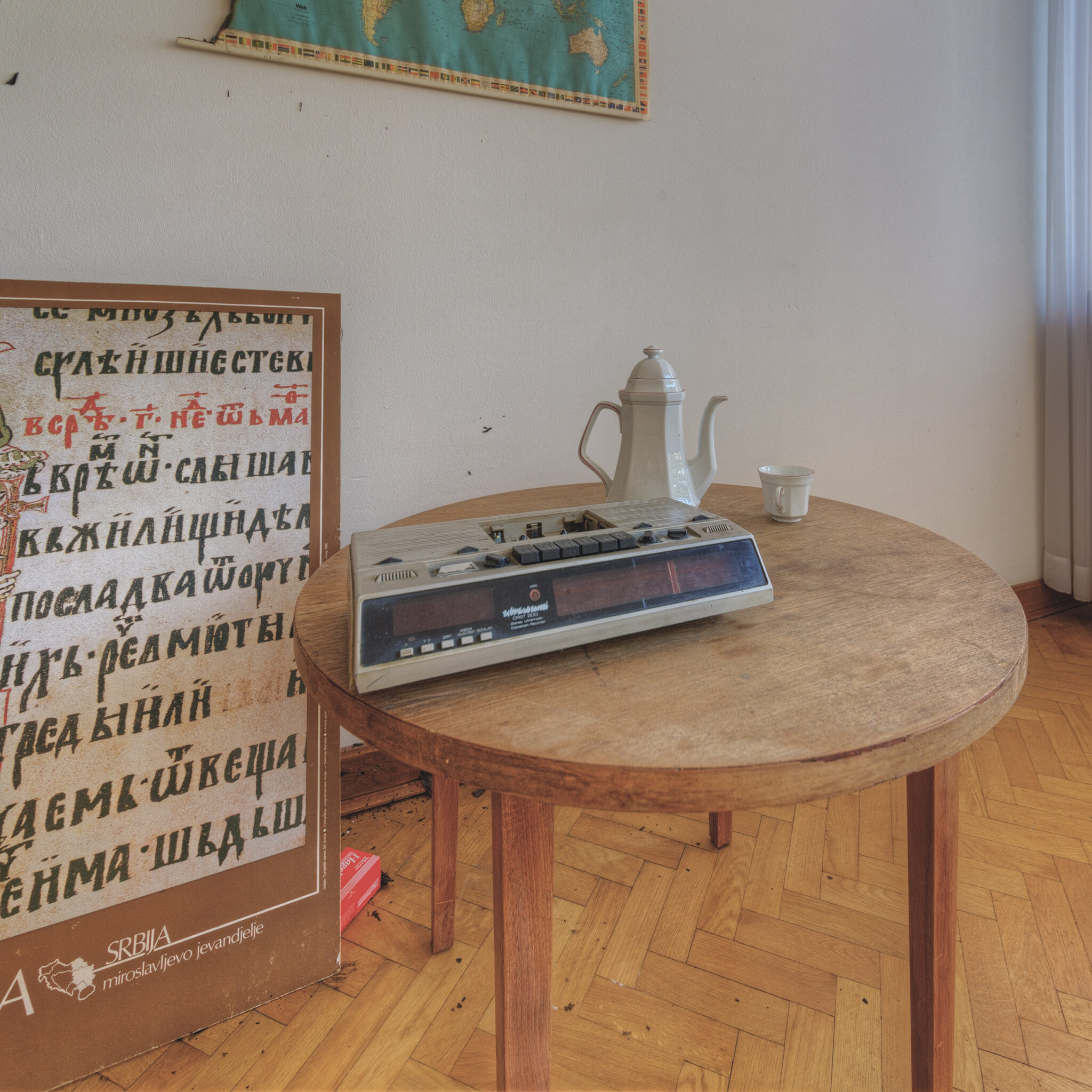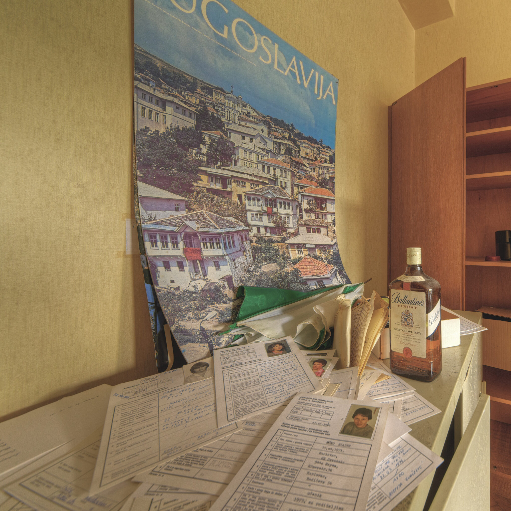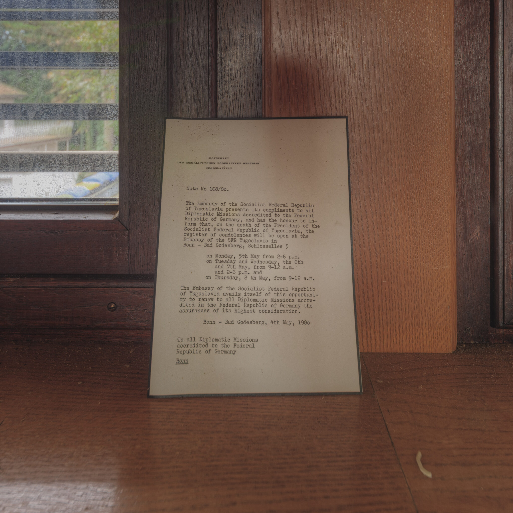 Ein Raum, der besonders auffiel, war das Büro eines Botschafters. Hier standen noch die Möbel, als hätten die Bewohner den Raum nur für einen Moment verlassen und wären nie zurückgekehrt. Die Vorhänge waren halb geschlossen, und das Licht fiel gedämpft durch die Fenster, was dem Raum eine fast geisterhafte Atmosphäre verlieh. In einer Ecke entdeckte ich ein altes Dokument in einem Bilderrahmen, das auf den 4. Mai 1980 datiert war. Es war eine Mitteilung an alle diplomatischen Missionen, die den Tod eines wichtigen jugoslawischen Staatsführers ankündigte – ein Beweis für die einstige Bedeutung dieses Ortes.