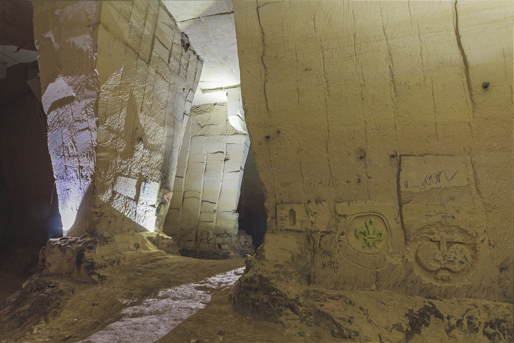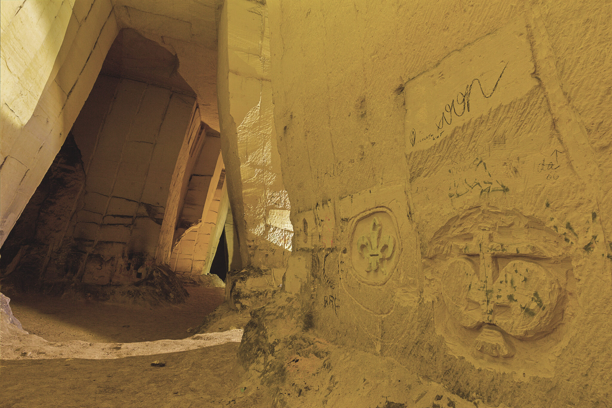 Eine überraschende Entdeckung waren die Skulpturen und Schnitzereien im weichen Stein der Mergelgruben. Ganze Dörfer wurden in den Stein geritzt, ebenso Wappen, Symbole und Figuren. Diese Kunstwerke zieren die Wände des unterirdischen Labyrinths und zeugen von einer beeindruckenden Vergangenheit. Leider sind viele dieser historischen Artefakte durch unachtsame Besucher und Graffiti beschädigt.