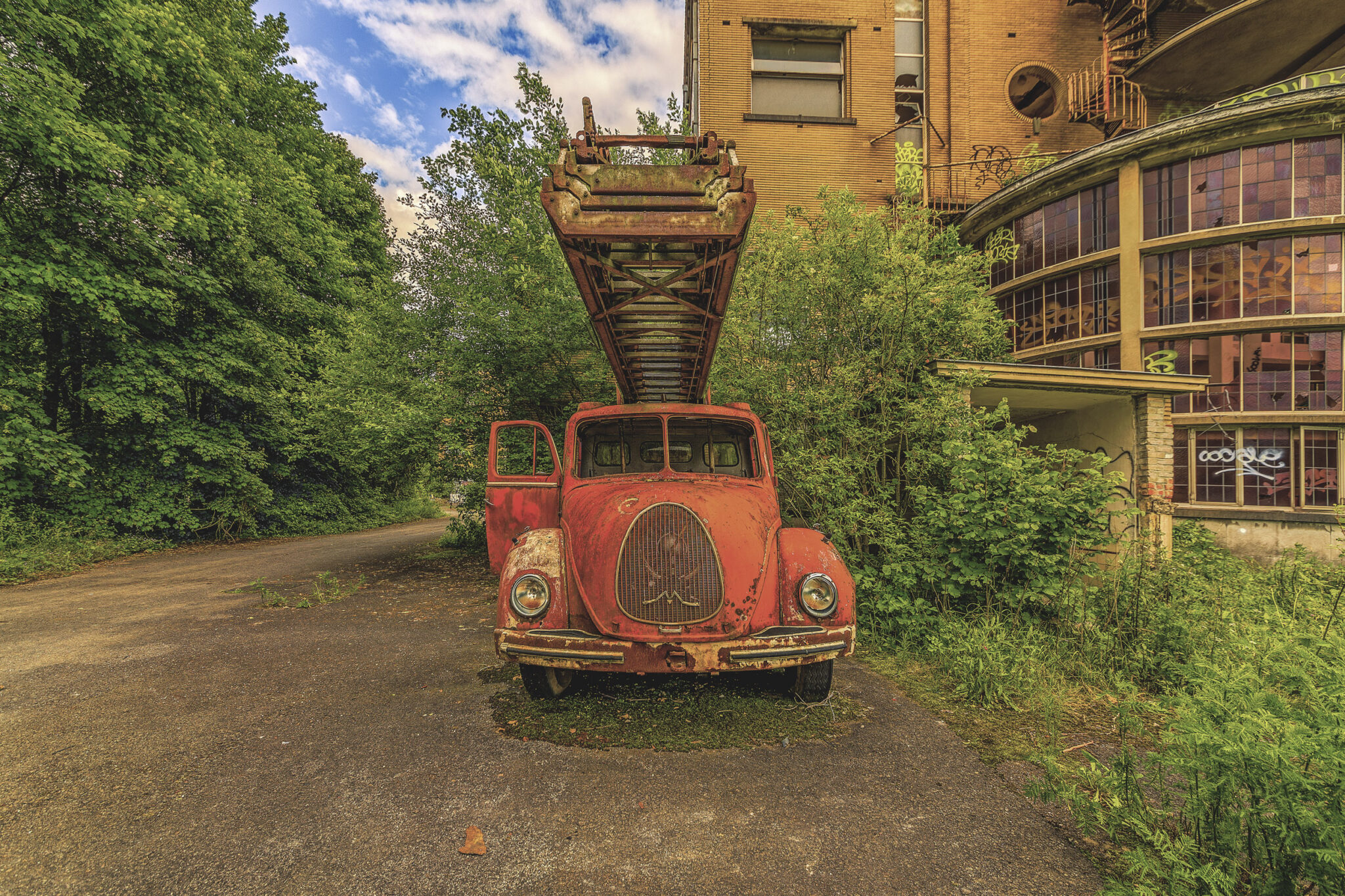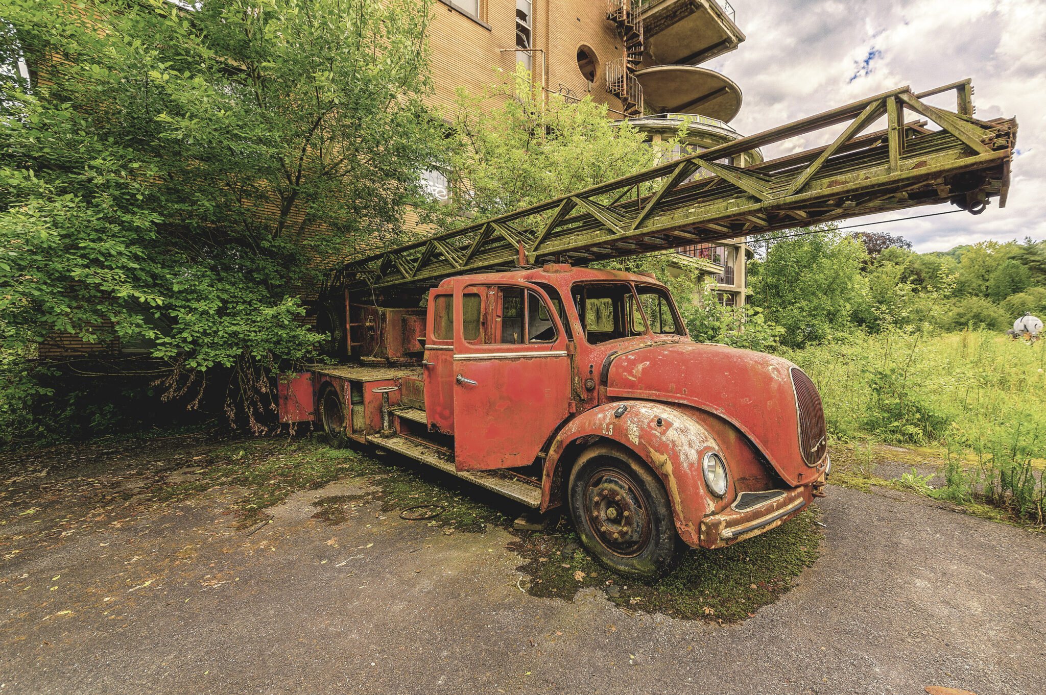 Feuerwehrfahrzeug: Der Renault-Feuerwehrwagen vor dem Gebäude stammt aus den 1950er Jahren und war früher für den Brandschutz des Preventoriums zuständig. Das Fahrzeug war technisch fortschrittlich für seine Zeit, ausgestattet mit einer hydraulischen Leiter und robusten Reifen, die es auch in schwierigem Gelände einsatzfähig machten. Heute ist es ein beliebtes Fotomotiv für Urbexer und ein stiller Zeuge der vergangenen Zeiten.