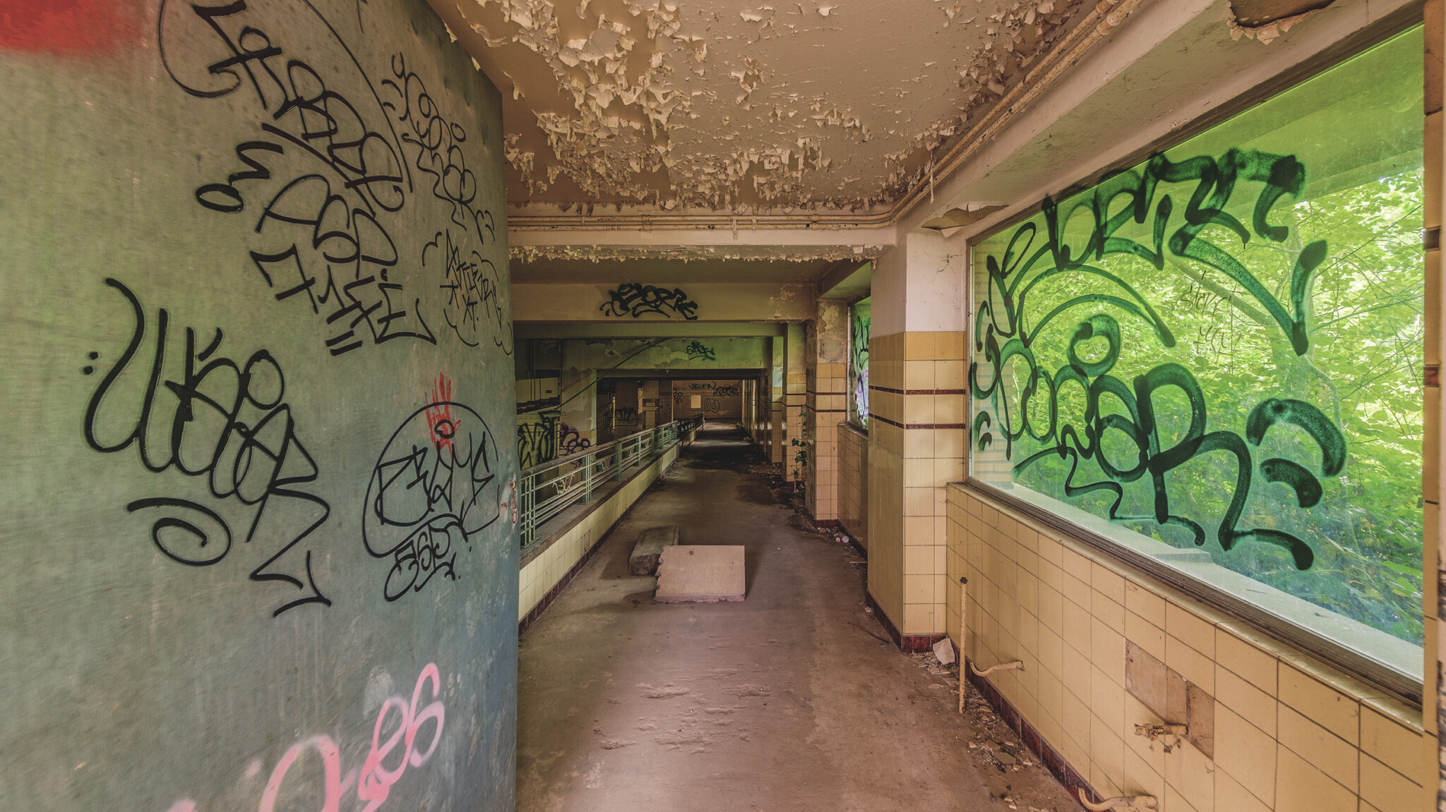 Im Inneren des Gebäudes empfing mich eine gespenstische Stille. Die Gänge, die einst von Ärzten, Pflegekräften und Patienten frequentiert wurden, lagen jetzt still und verlassen. Jeder Schritt, den ich auf den alten Fliesen machte, hallte durch die langen Korridore. Es roch nach Feuchtigkeit, nach Verfall und Moder. Überall fanden sich Spuren von Vandalismus: Graffiti, zerbrochene Fenster und Türen, die aus den Angeln gehoben worden waren. Es war klar, dass hier nicht nur die Zeit ihre Spuren hinterlassen hatte – auch frühere Besucher hatten das Gebäude stark in Mitleidenschaft gezogen.