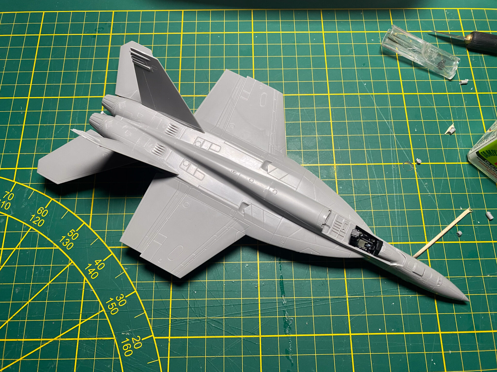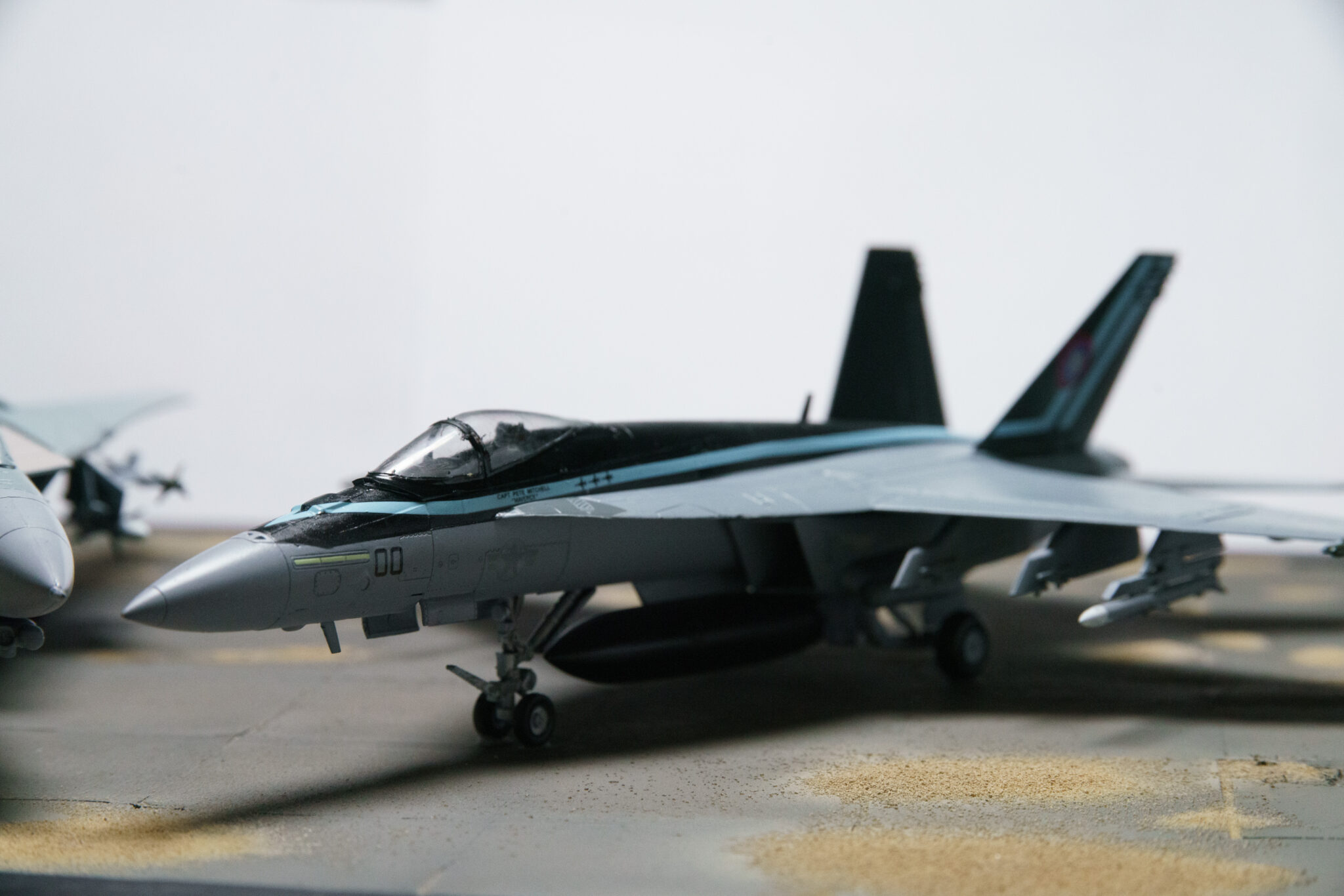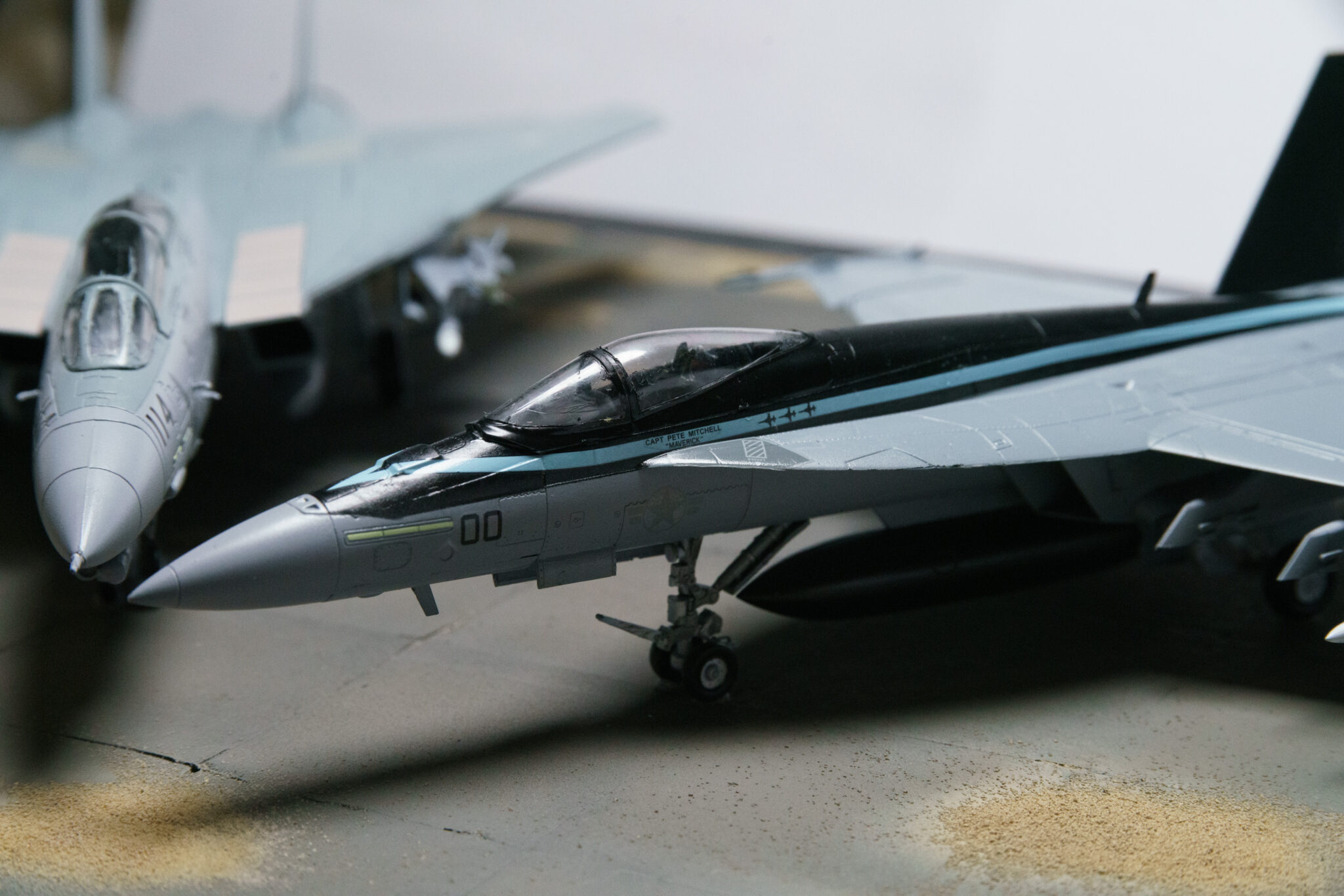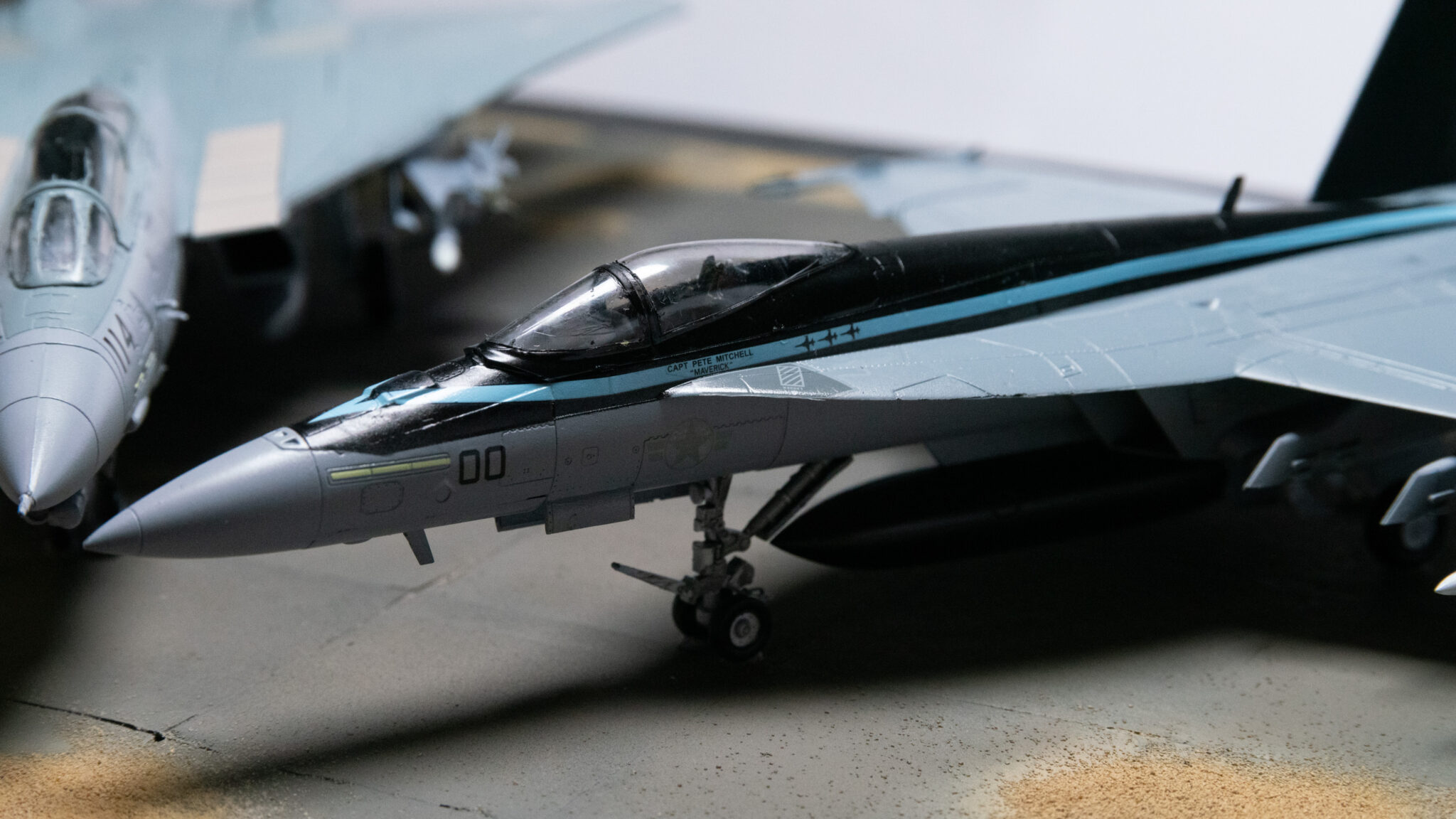 Die F-14A Tomcat begrüßte mich mit altbekannten Formen, klassisch amerikanisch. Die F/A-18E Super Hornet – modern, schnittig, mit vielen feinen Details am Rumpf und bugseitig. Beim Bau kam echtes Kinofeeling auf: Musik aus dem Soundtrack, und der Geruch von frischer Emailfarbe lag in der Luft. Kleine Versäumnisse rächen sich sofort: Bei der Tomcat hatte ich die Cockpit-Scheibe nicht 100% angepasst. Der Spalt ließ sich nur noch mit Trick 17 und ein bisschen Füllmasse kaschieren. Das ist eben Realität am Basteltisch.