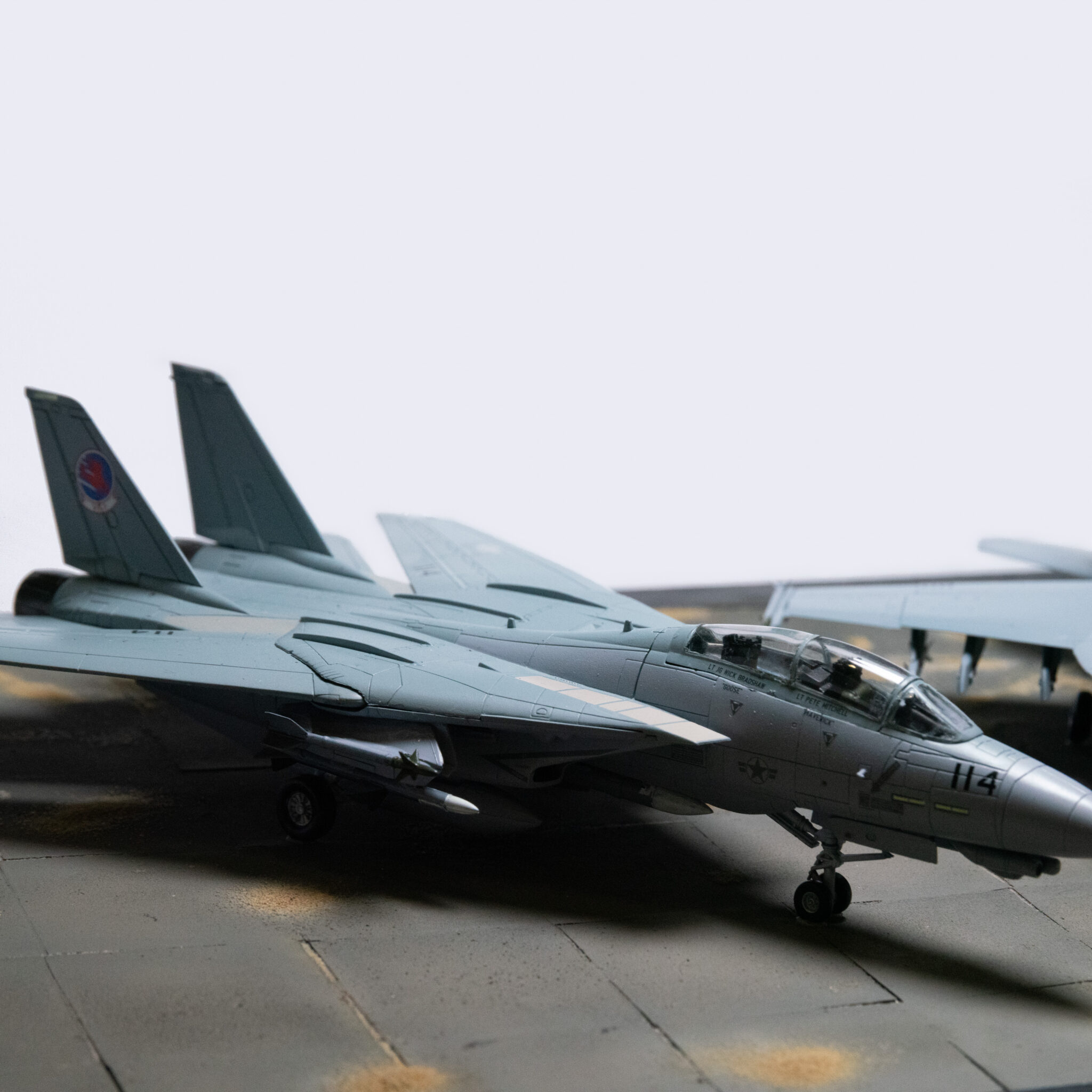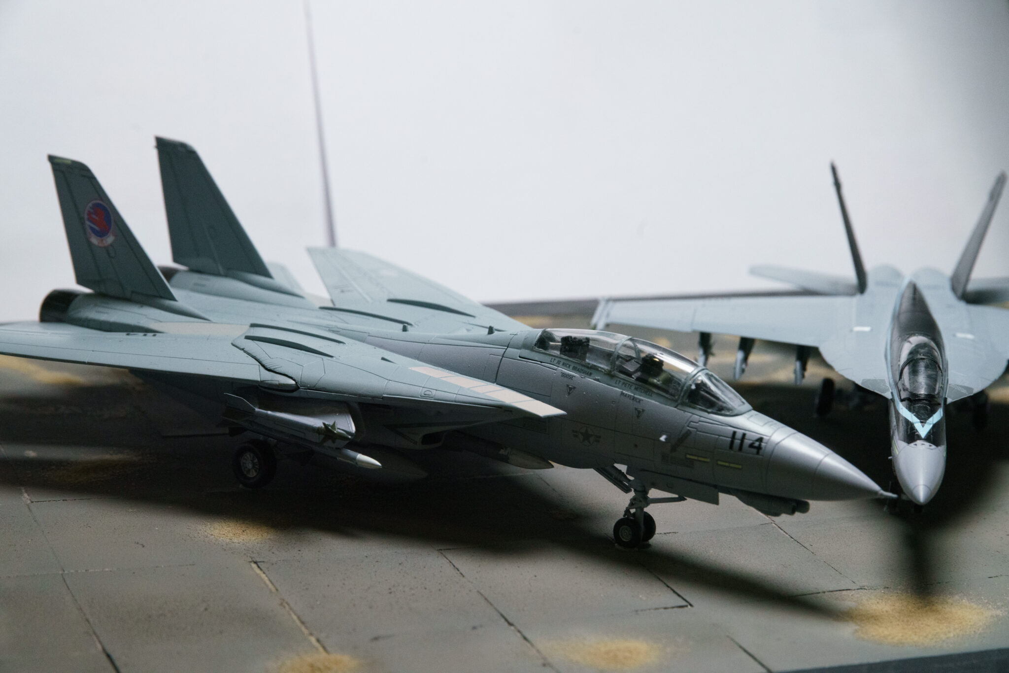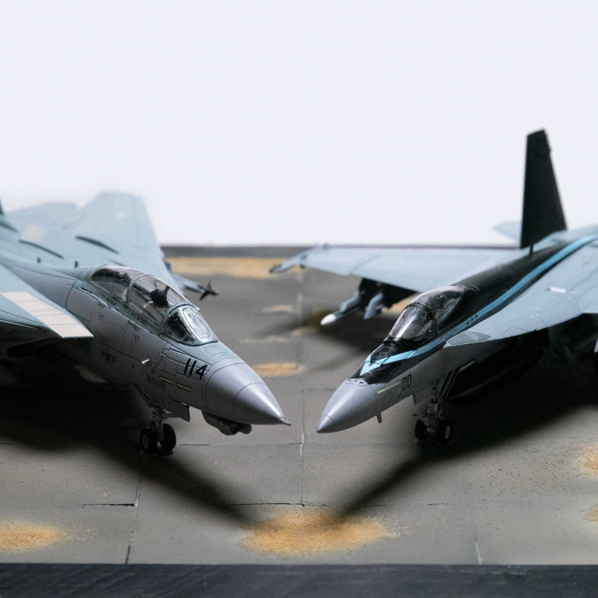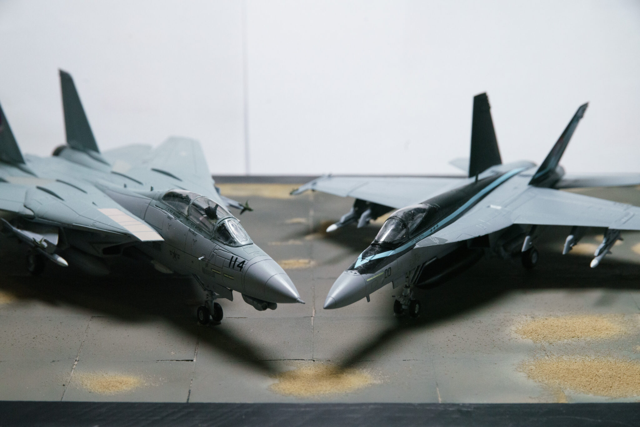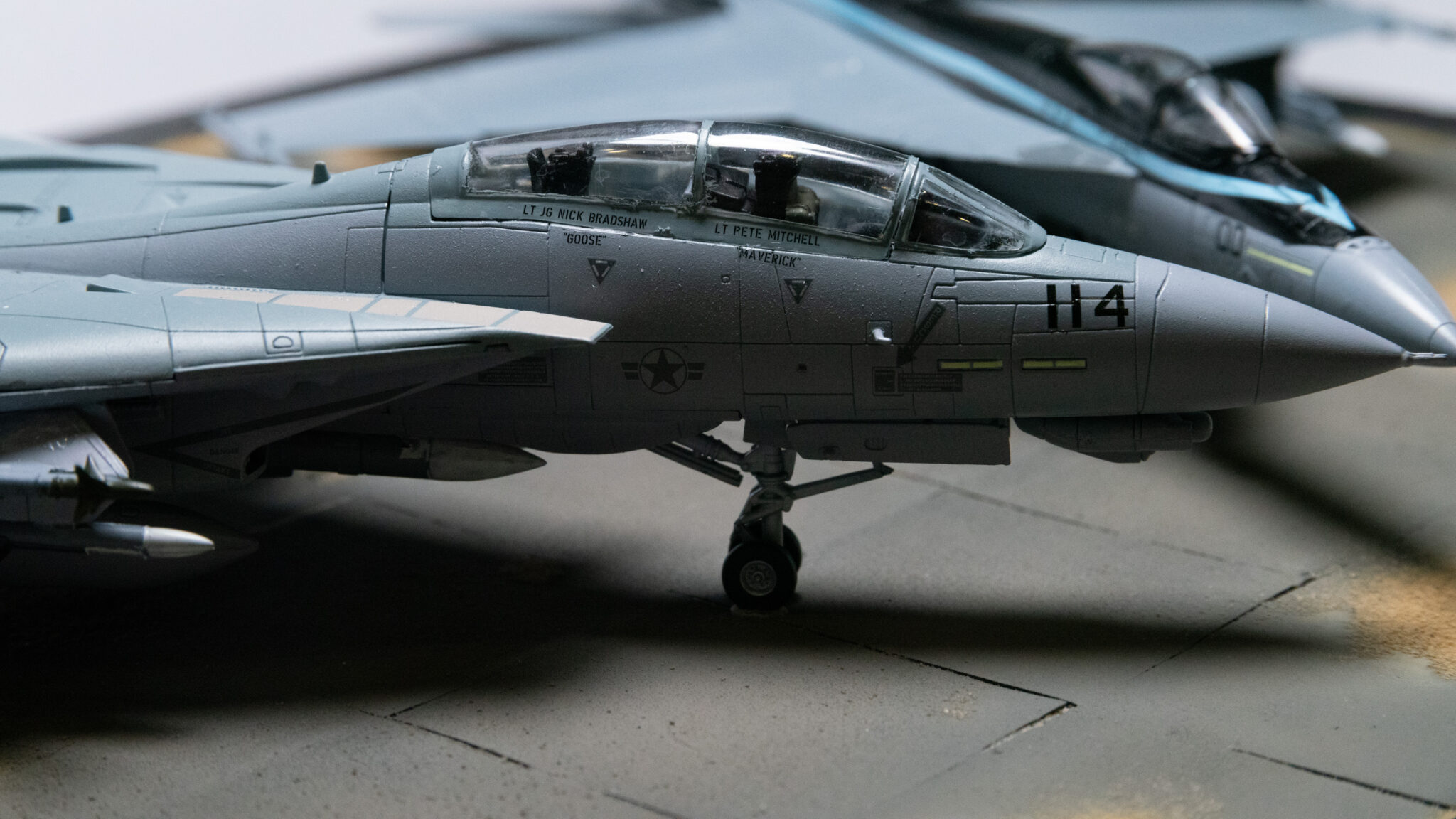 Zwei Jets, die Generationen geprägt haben – und endlich auf meiner Werkbank: die F-14A Tomcat und die F/A-18E Super Hornet, stilecht wie in „Top Gun“ und „Top Gun: Maverick“. Dass ich dieses Diorama bauen wollte, war eigentlich keine Frage. Das war eine Herzensangelegenheit. Ich wollte das Gefühl der Filme einfangen: die Spannung, den Stolz, und ganz ehrlich auch den Kindheitstraum, einmal selbst im Cockpit zu sitzen. Gerade weil beide Jets Ikonen der Filmgeschichte sind, war es ein ambitioniertes Vorhaben – mit vielen kleinen Fallen und überraschenden Glücksmomenten.