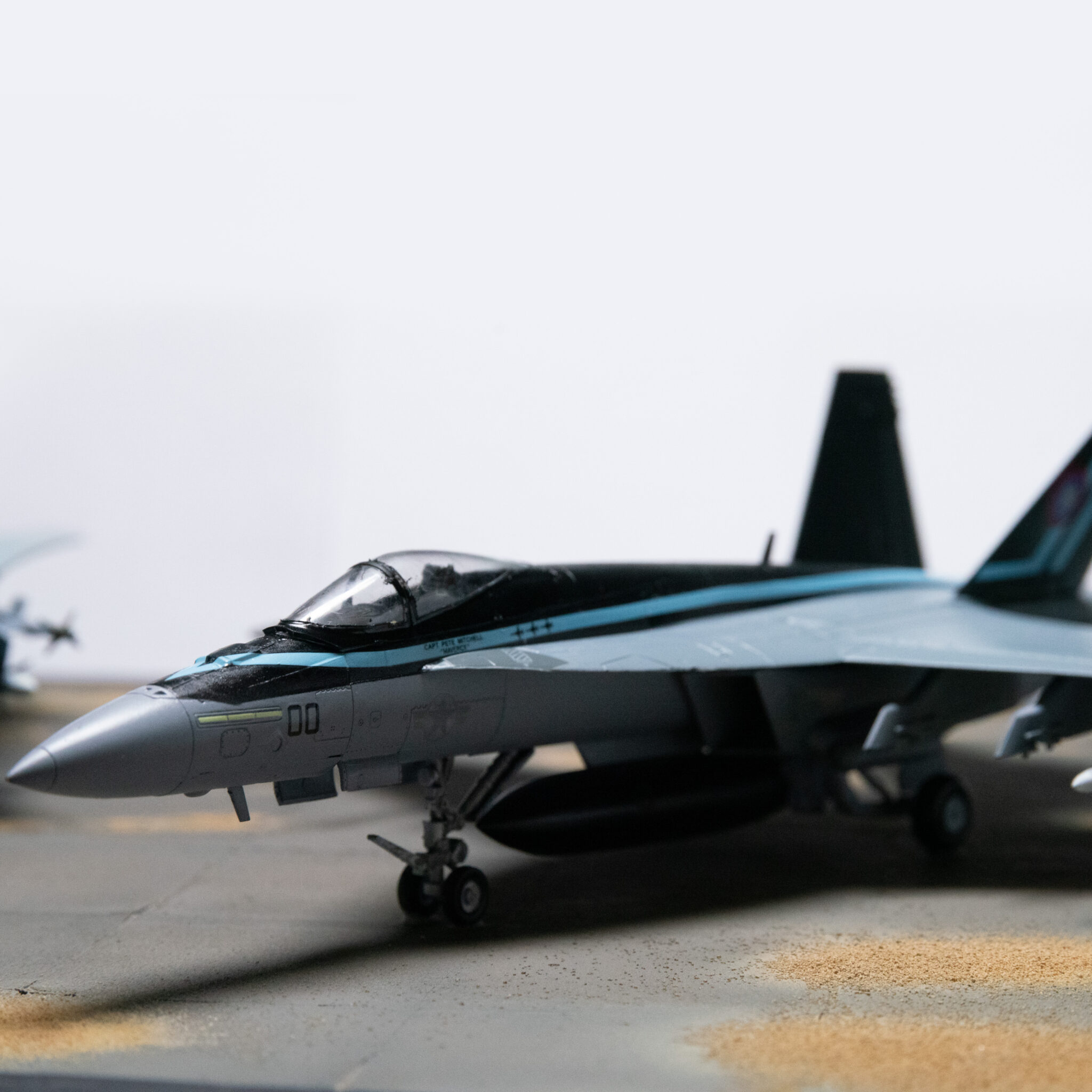 Super Hornet: Dreiton-Grauschemen im Low-Vis-Style, umgesetzt mit Vallejo Model Air 71.279 (Light Ghost Gray), 71.120 (Dark Ghost Gray) und kleinen Akzenten mit AMMO by MIG (A.MIG-203). Besonderheit: Die charakteristischen blauen Streifen sind im Film und im Revell-Bogen als Decal ausgelegt, was eine Fummelei.