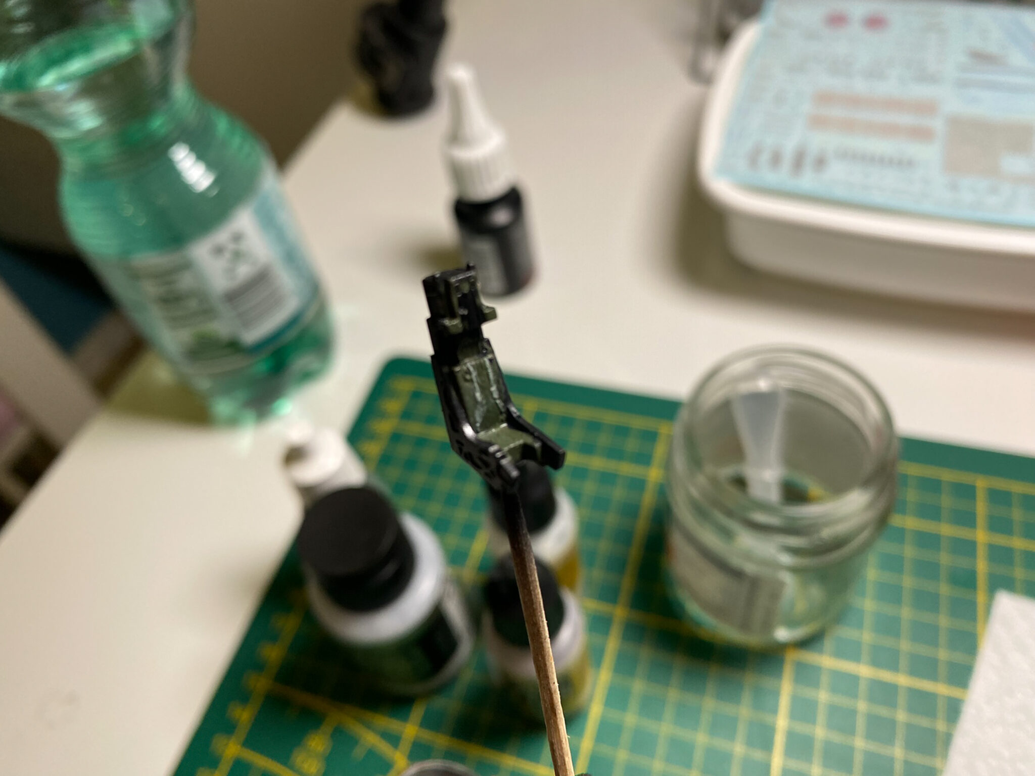 Fünf Wochen hatte ich mir selbst gesetzt – Deadline war der Geburtstag des Bruders meiner Frau. Was anfangs „locker machbar“ schien, wurde zum Endspurt, unterstützt von Forentipps und einer spürbaren Portion Koffein. Besonders die Farbmischung der Tomcat war ein Abenteuer: Revell listet für die Oberseite FS 16440 Gull Gray, ich hatte aber nur AK 3rd Gen und Vallejo Model Color im Regal. Am Ende mischte ich so lange, bis ein fast identischer Türkis-Grauton raus kam – improvisieren gehört eben dazu.