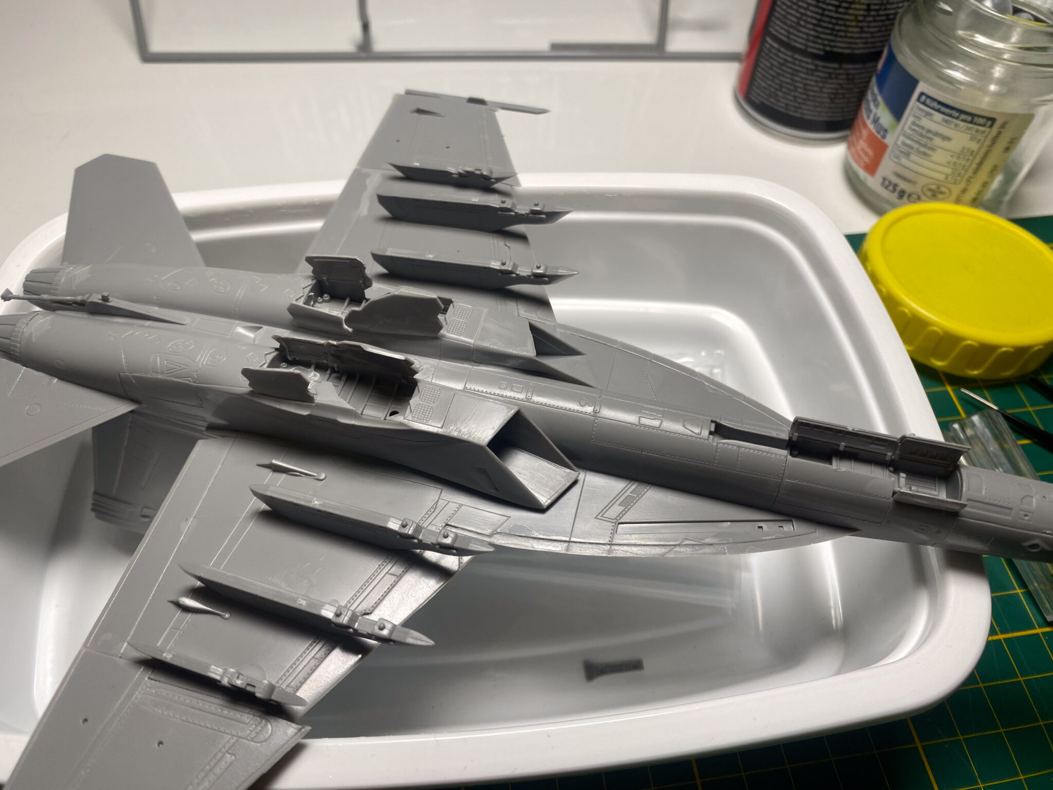 Die Super Hornet hingegen war fast schon Plug-and-Play. Revell legt die Bauteile so aus, dass kaum Schleifarbeiten nötig sind. Nur die markanten blauen Streifen – typisch Filmoptik! – trieben mich fast in den Wahnsinn, weil sie aus Einzelteilen zusammengesetzt werden und wirklich überhaupt keine Fehler verzeihen.